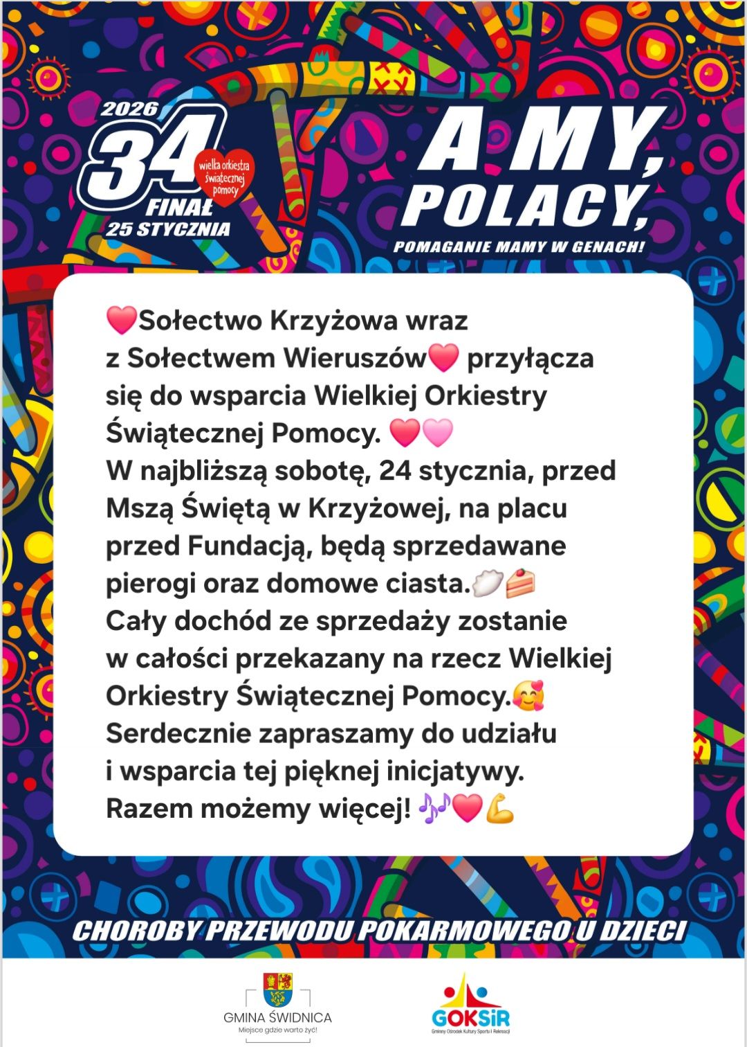 Przed nami wielkie święto pomagania, czyli 34. Finał Wielkiej Orkiestry Świątecznej Pomocy. 25 stycznia w powiecie świdnickim do Orkiestrowego grania zachęcać będzie połączony sztab świdnicko-marcinowicki, a także sztaby z Jaroszowa, Jaworzyny Śląskiej, Strzegomia, gminy Świdnica, Świebodzic oraz Żarowa.