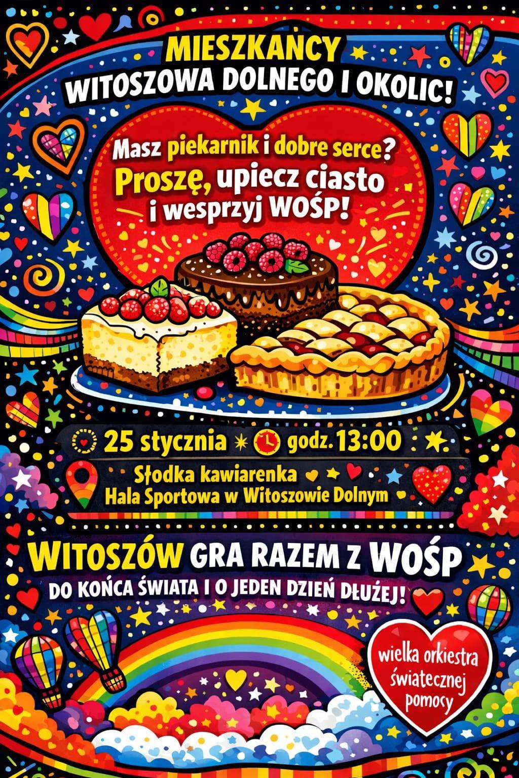 W niedzielę, 25 stycznia w hali sportowej w Witoszowie Dolnym odbędzie się gminny Finał Wielkiej Orkiestry Świątecznej Pomocy. – Zapraszamy Was całymi rodzinami na gminny finał WOŚP – dzień pełen muzyki, atrakcji, dobrej energii i wspólnego grania do końca świata i jeden dzień dłużej. Od godziny 15:00 na scenie będzie czekać na Was mnóstwo występów tanecznych, muzycznych i pokazów: mażoretki, cheerleaderki, grupy taneczne, występy dzieci i młodzieży, koncerty z najlepszą muzyką, wspólne odśpiewanie hymnu WOŚP, na zakończenie: muzyczne światełko do nieba – mówią organizatorzy.
