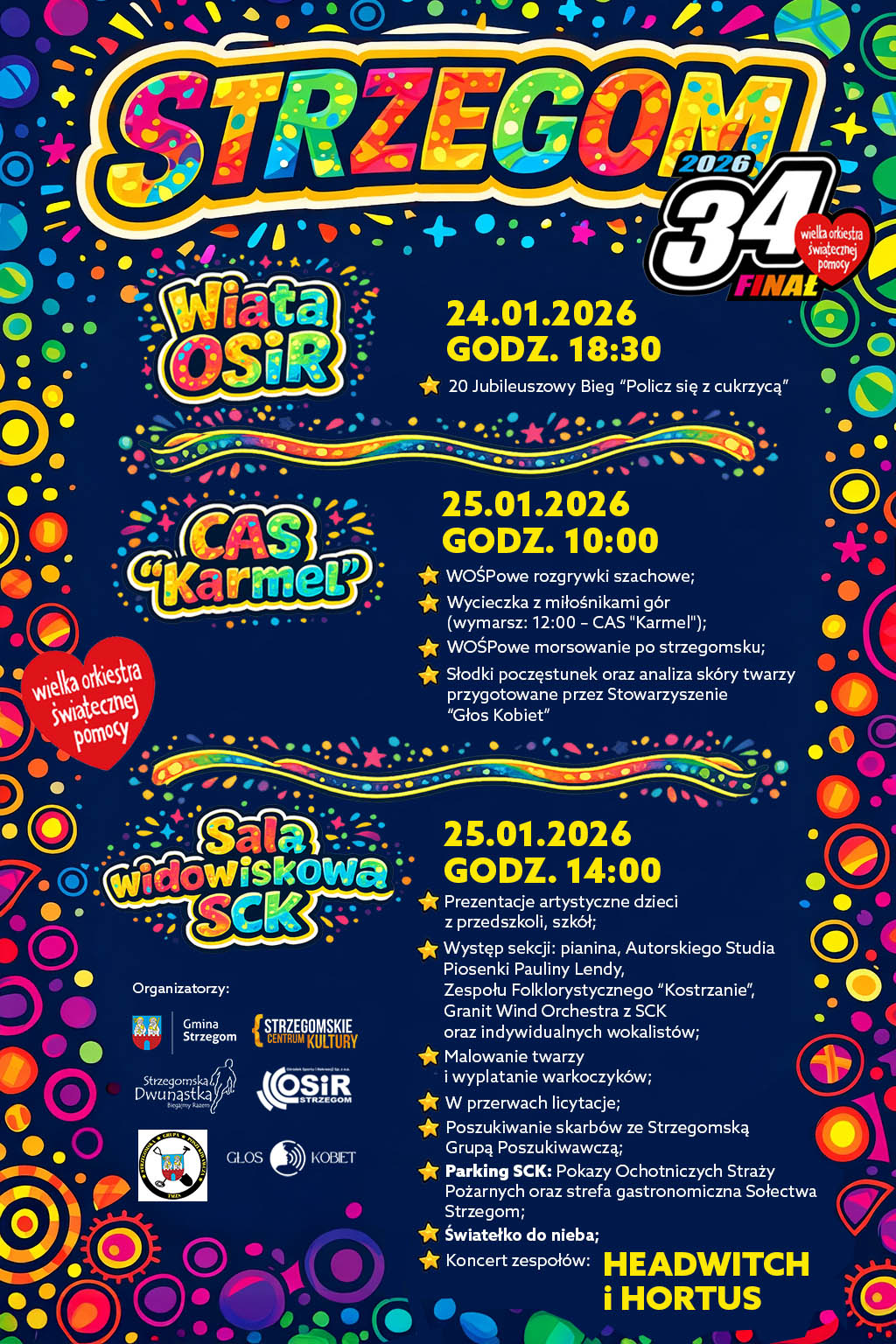 Od godziny 14.00 wydarzenia przeniosą się do sali widowiskowej Strzegomskiego Centrum Kultury, gdzie wystąpią dzieci z lokalnych placówek oświatowych i członkowie sekcji artystycznych, działających przy SCK. – Mocne, rockowo-metalowe zakończenie zagwarantują koncerty zespołów Headwitch i Hortus. W międzyczasie będziemy prowadzić licytacje – wymienia Ewa Bereta ze Strzegomskiego Centrum Kultury. Równolegle na parkingu SCK odbywać się będą warsztaty ze Strzegomską Grupą Poszukiwawczą oraz pokazy Ochotniczych Straży Pożarnych. 34. Finał WOŚP w Strzegomiu zakończy się tradycyjnym światełkiem do nieba.
