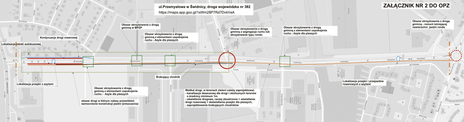 Jakie zmiany są planowane na Przemysłowej? Zgodnie z założeniami ujętymi w materiałach przetargowych, na odcinku od skrzyżowania z ulicą Szarych Szeregów do ulicy Metalowców projektanci mają przewidzieć wzmocnienie konstrukcji jezdni, wzdłuż ulicy ma zostać zaprojektowana nowa kanalizacja deszczowa, oświetlenie drogowe i brakujące chodniki. Na wysokości osiedla Kolonia, po obu stronach Przemysłowej, mają zostać zaprojektowane zatoki autobusowe. Przewidziano też remont istniejącego ronda im. Andrzeja Scheera u zbiegu ulic Kopernika, Okrężnej i Przemysłowej, a także wykonanie elementów poprawiające bezpieczeństwo: przejścia dla pieszych mają zostać doświetlone a dodatkowo mają zostać wybudowane azyle dla pieszych. W wytycznych uwagę projektantów zwrócono też na skrzyżowanie ulic Przemysłowej i Metalowców, sugerując możliwość jego przebudowania lub wybudowania ronda.