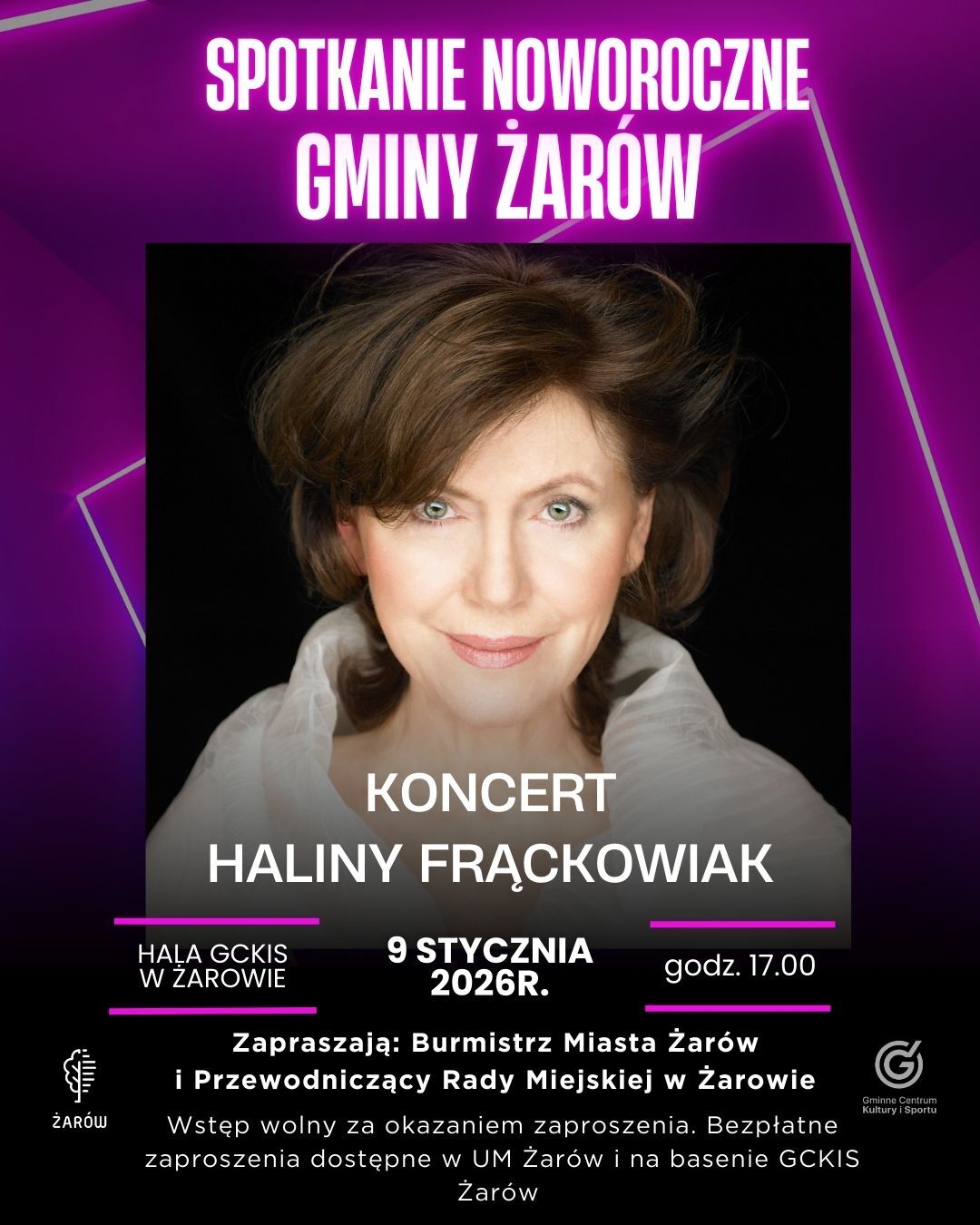 Znana polska piosenkarka Halina Frąckowiak wystąpi podczas spotkania noworocznego gminy Żarów, które odbędzie się w piątek, 9 stycznia 2026r. o godz. 17.00 w hali widowiskowo-sportowej Gminnego Centrum Kultury i Sportu w Żarowie. Liczba miejsc ograniczona. Wstęp na wydarzenie za okazaniem bezpłatnego zaproszenia, które dostępne są w Urzędzie Miejskim w Żarowie (ul. Zamkowa 2, pok. nr 17) oraz w kasie basenu GCKiS (ul. Piastowska 10).