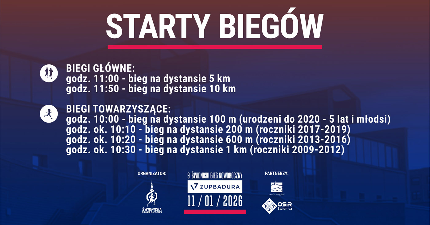 Na niedzielę, 11 stycznia zaplanowano dziewiątą edycję Świdnickiego Biegu Noworocznego. Rywalizacja odbędzie się na terenach zlokalizowanych w okolicy hali widowiskowo-sportowej im. Haliny Aszkiełowicz-Wojno na Zawiszowie. W planie biegi główne na 5 i 10 kilometrów, jak również biegi towarzyszące dla dzieci i młodzieży. Organizatorzy zachęcają do kibicowania uczestnikom.