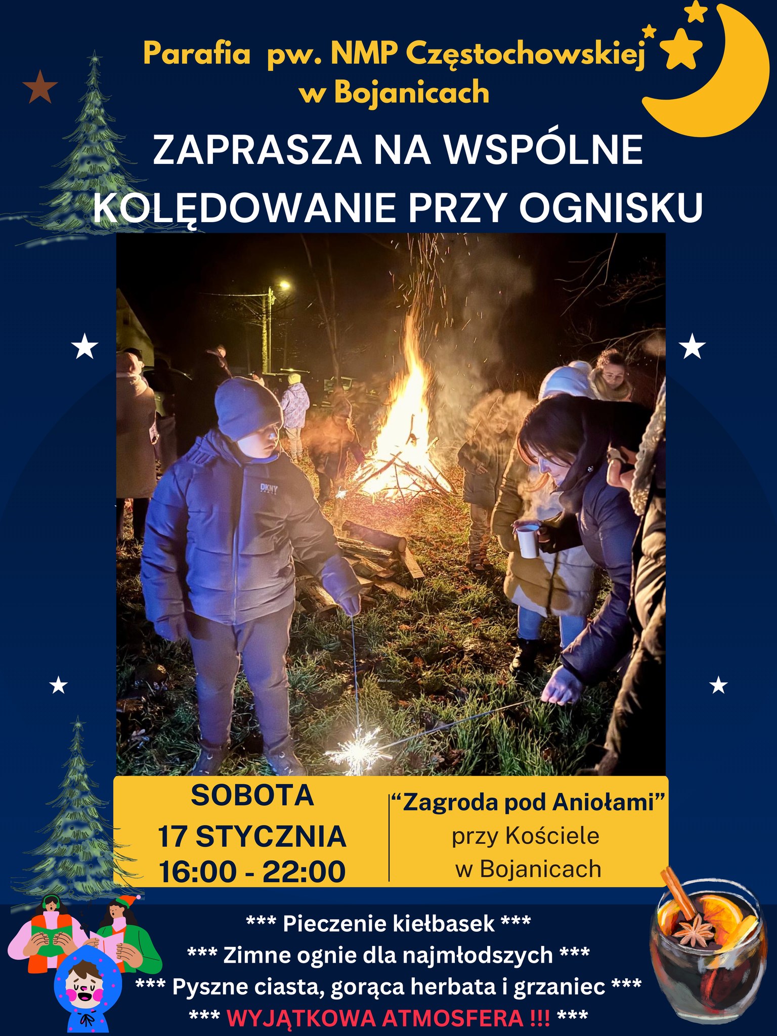 Parafia pw. NMP Częstochowskiej w Bojanicach zaprasza na wspólne kolędowanie przy ognisku, które odbędzie się w sobotę, 17 stycznia na terenie „Zagrody pod Aniołami” przy kościele w Bojanicach. Wydarzenie rozpocznie się o godzinie 16.00 i potrwa do 22.00.