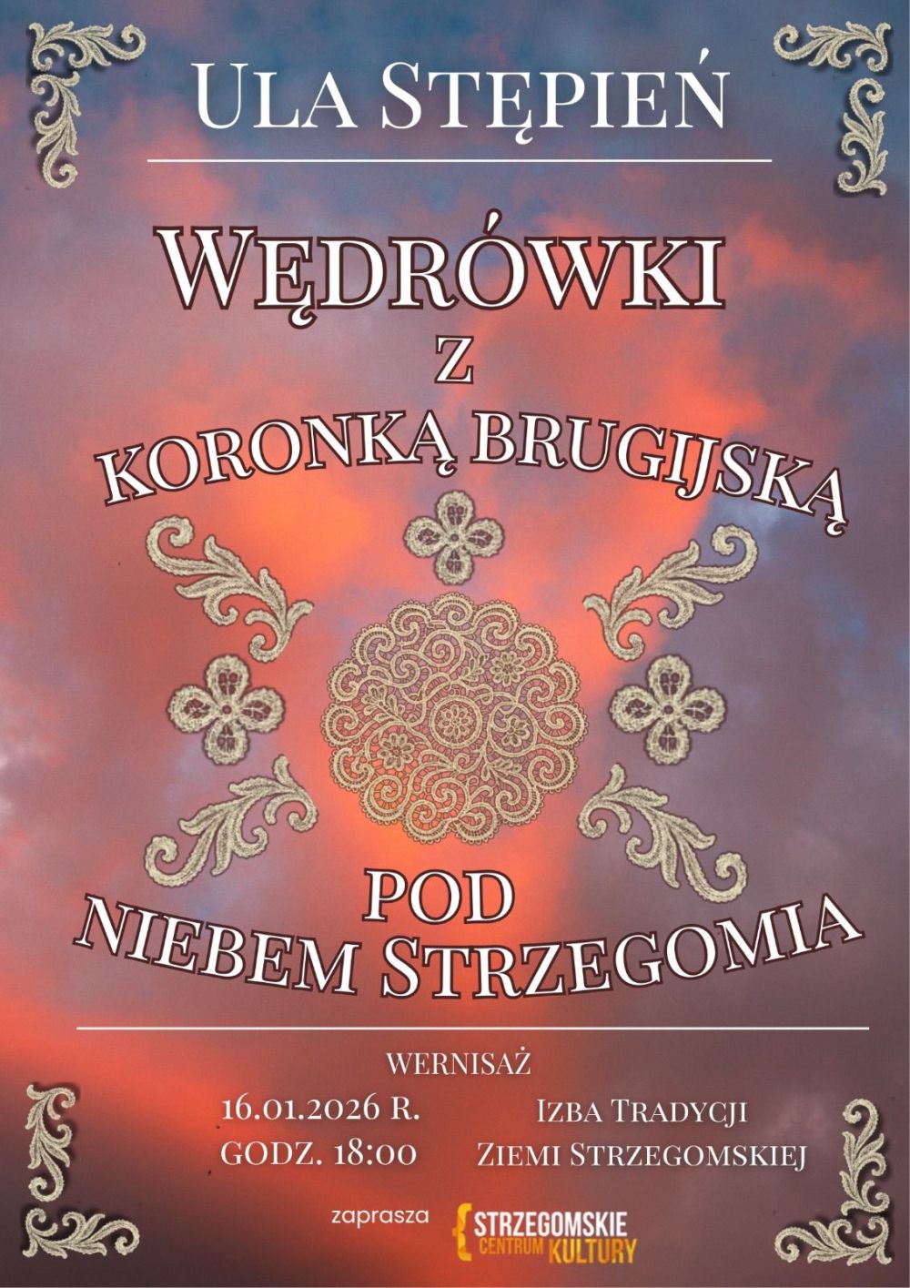 Strzegomskie Centrum Kultury zaprasza na wernisaż wystawy Uli Stępień „Wędrówki z koronką brugijską pod niebem Strzegomia”, który odbędzie się w piątek, 16 stycznia 2026 roku o godz. 18:00 w Izbie Tradycji Ziemi Strzegomskiej, mieszczącej się w Centrum Aktywności Społecznej Karmel.