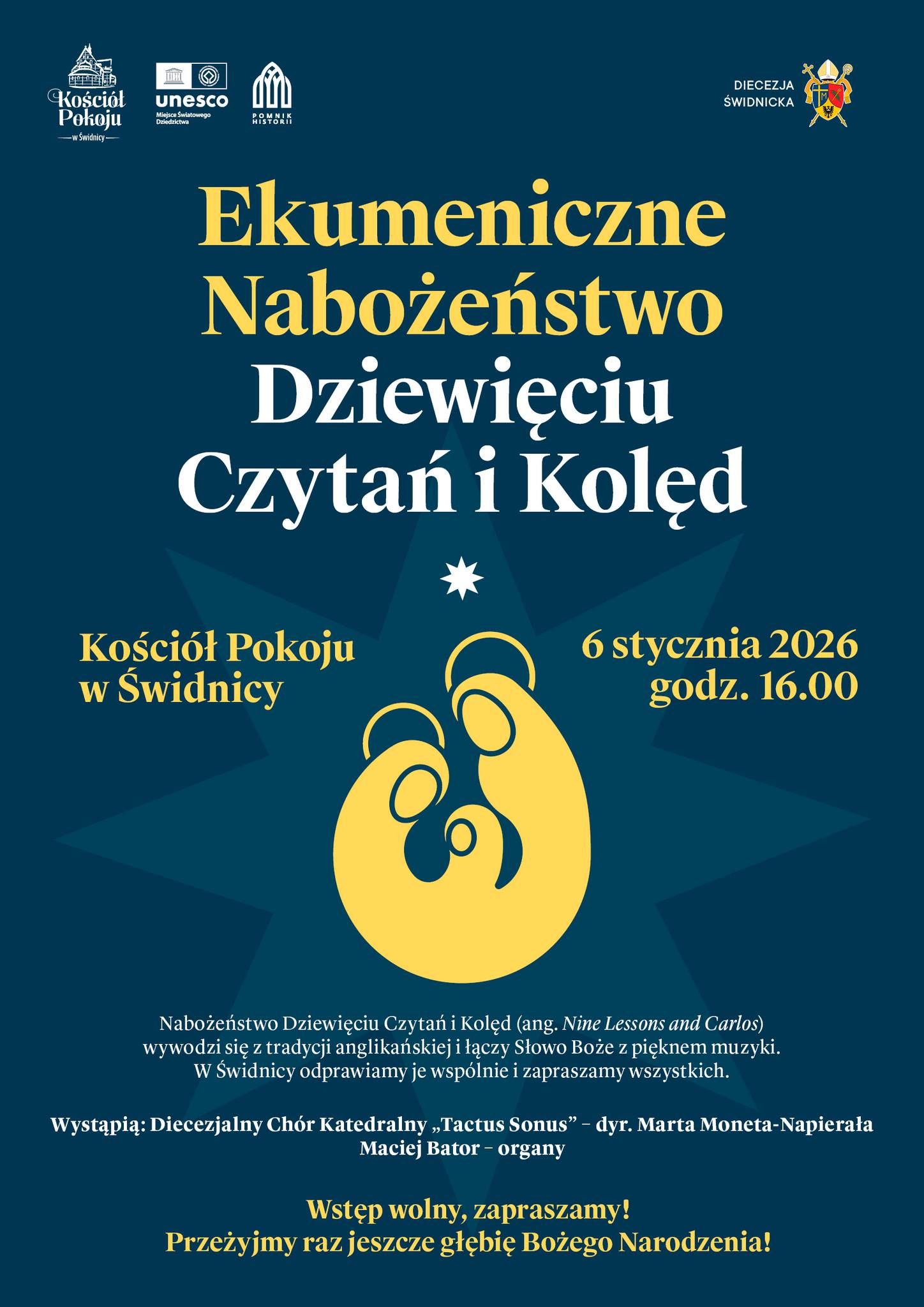 Rok temu nabożeństwo zorganizowane zostało w formule ekumenicznej w rzymskokatolickiej katedrze św. Stanisława i św. Wacława w Świdnicy. Tym razem organizatorzy: Diecezja Świdnicka Kościoła Rzymskokatolickiego i Parafia Ewangelicko-Augsburska w Świdnicy wspólnie zapraszają do świdnickiego Kościoła Pokoju. Nabożeństwo Dziewięciu Kolęd i Czytań odbędzie się 6 stycznia 2026 roku o godz. 16.00. Wystąpią: Diecezjalny Chór Katedralny „Tactus Sonus” pod dyrekcją Marty Monety-Napierały, a także kantor kościoła Maciej Bator. Wstęp wolny.