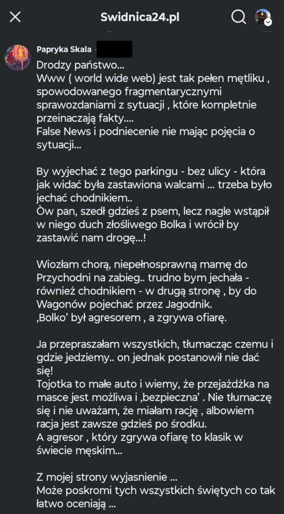 Do całej sprawy w komentarzu na fanepage’u Swidnica24.pl odniosła się sama kierująca.