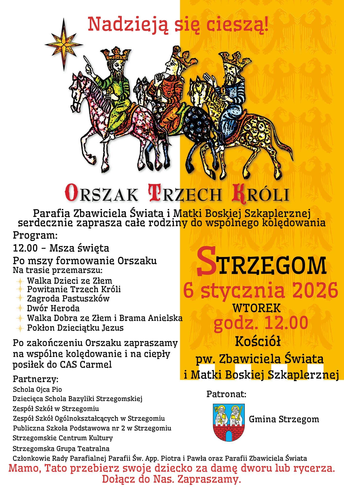 Parafia pw. Najświętszego Zbawiciela Świata i Matki Boskiej Szkaplerznej z Góry Karmel w Strzegomiu zaprasza całe rodziny do uczestnictwa w Orszaku Trzech Króli. – O godz. 12.00 w kościele odbędzie się msza św., po której orszak wyruszy ulicami naszego miasta (ul. Kościuszki, Rynek, ul. Paderewskiego i ul. Bankowa). Orszak zakończy się w kościele, gdzie odbędzie się kulminacyjny punkt wydarzenia, złożymy pokłon Nowonarodzonemu Jezusowi. Zapraszamy do wspólnego orszakowego kolędowania. Prosimy o przebranie dzieci za damy dworu, rycerzy lub aniołki – informują organizatorzy, którzy po zakończeniu orszaku zapraszają do wspólnego kolędowania oraz na ciepły posiłek do Centrum Aktywności Społecznej „Karmel”.