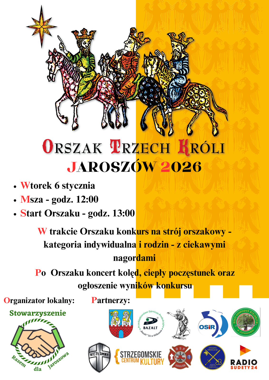 6 stycznia pod hasłem „Nadzieją się cieszą” na ulice kilkuset miejscowości w kraju wyruszą Orszaki Trzech Króli. Barwne korowody przejdą m.in. przez Świdnicę, Strzegom, Jaroszów, Świebodzice i Mokrzeszów.