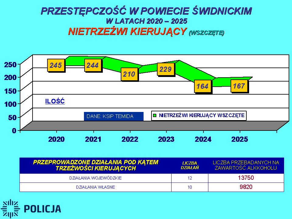– Na drogach powiatu świdnickiego w 2025 roku odnotowano 141 wypadków drogowych, w których rannych zostało 164 osób, a śmierć niestety poniosło aż 6 osób. Na drogach powiatu świdnickiego w 2025 roku odnotowano 1790 kolizji drogowych. Działania policjantów zarówno te wojewódzkie, jak i te własne ukierunkowana na bezpieczeństwo mieszkańców pozwoliły wyeliminować z dróg aż 167 nietrzeźwych kierujących – wylicza asp. Magdalena Ząbek z Komendy Powiatowej Policji w Świdnicy. Dla porównania, w 2024 roku na terenie całego powiatu świdnickiego doszło do 1629 kolizji oraz 136 wypadków, w wyniku których zginęło łącznie 9 osób a 186 zostało rannych. Rok wcześniej zatrzymano 164 nietrzeźwych kierujących.