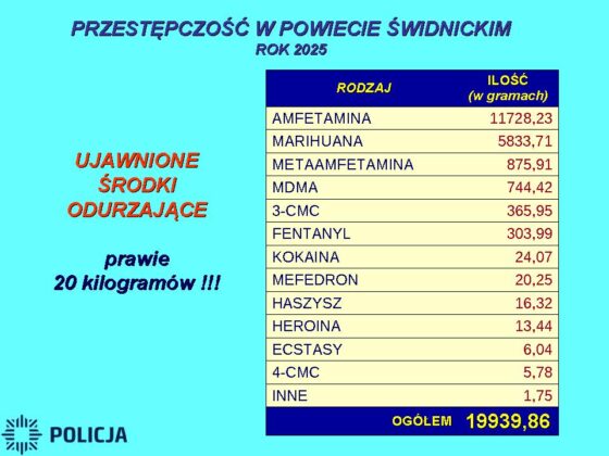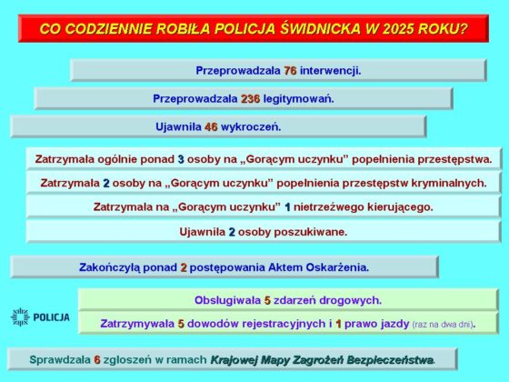 W 2025 roku świdniccy policjanci interweniowali blisko 28 tys. razy, zatrzymując na gorącym uczynku ponad tysiąc sprawców różnych przestępstw i legitymując w sumie ponad 86 tys. osób. W ubiegłym roku funkcjonariusze zabezpieczyli blisko 20 kg narkotyków, w ramach prowadzonych postępowań karnych zabezpieczyli mienie o wartości blisko 5 milionów złotych, a także sporządzili 442 „Niebieskich Kart”