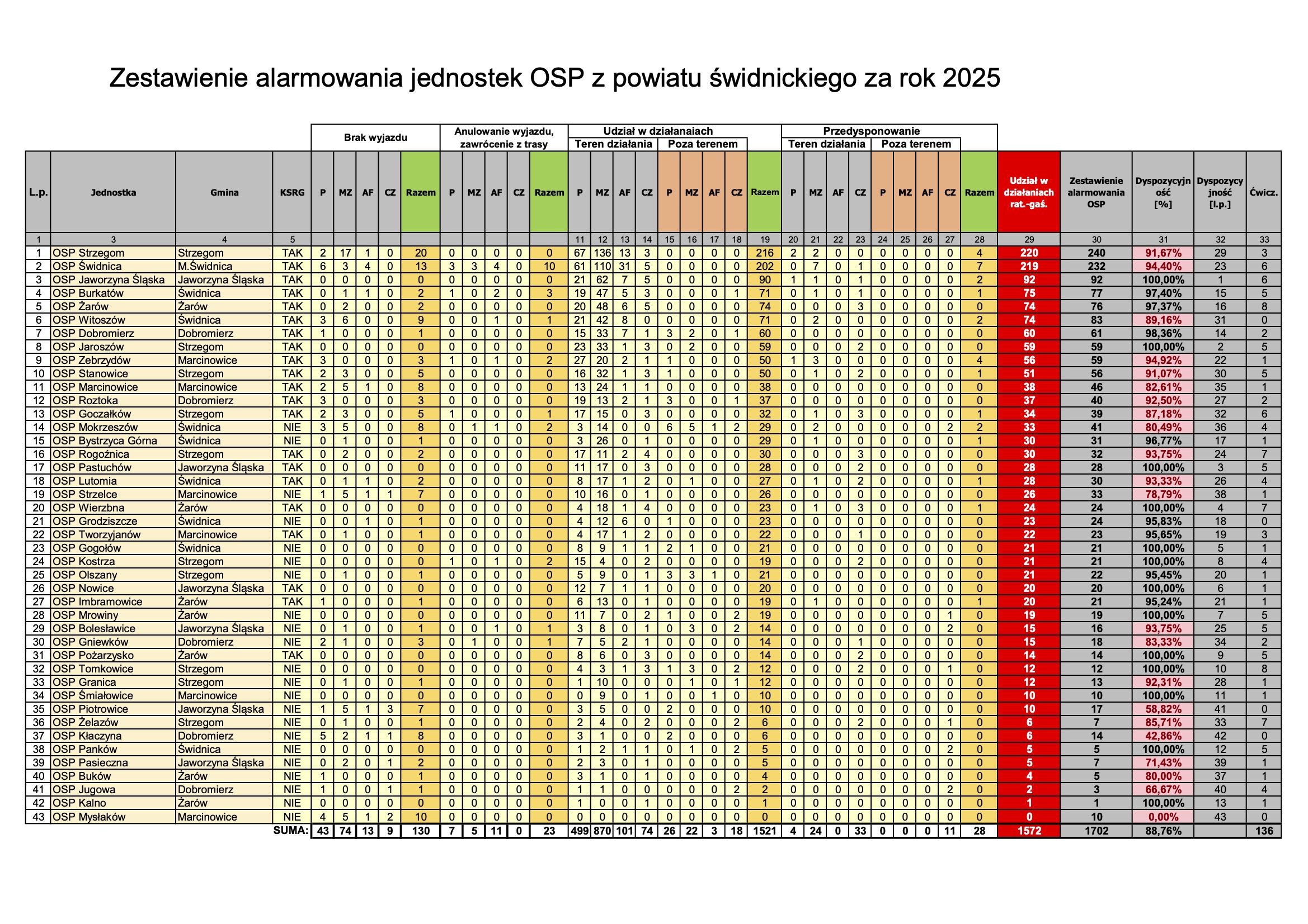 Które jednostki Ochotniczych Straży Pożarnych najczęściej uczestniczyły w działaniach ratowniczo-gaśniczych w minionym roku? Zgodnie z danymi Komendy Powiatowej PSP w Świdnicy, najwięcej razy do zdarzeń wyruszali druhowie z OSP Strzegom – 220 razy. W czołówce powiatu świdnickiego znalazły się też OSP Świdnica (219) oraz OSP Jaworzyna Śląska (92).