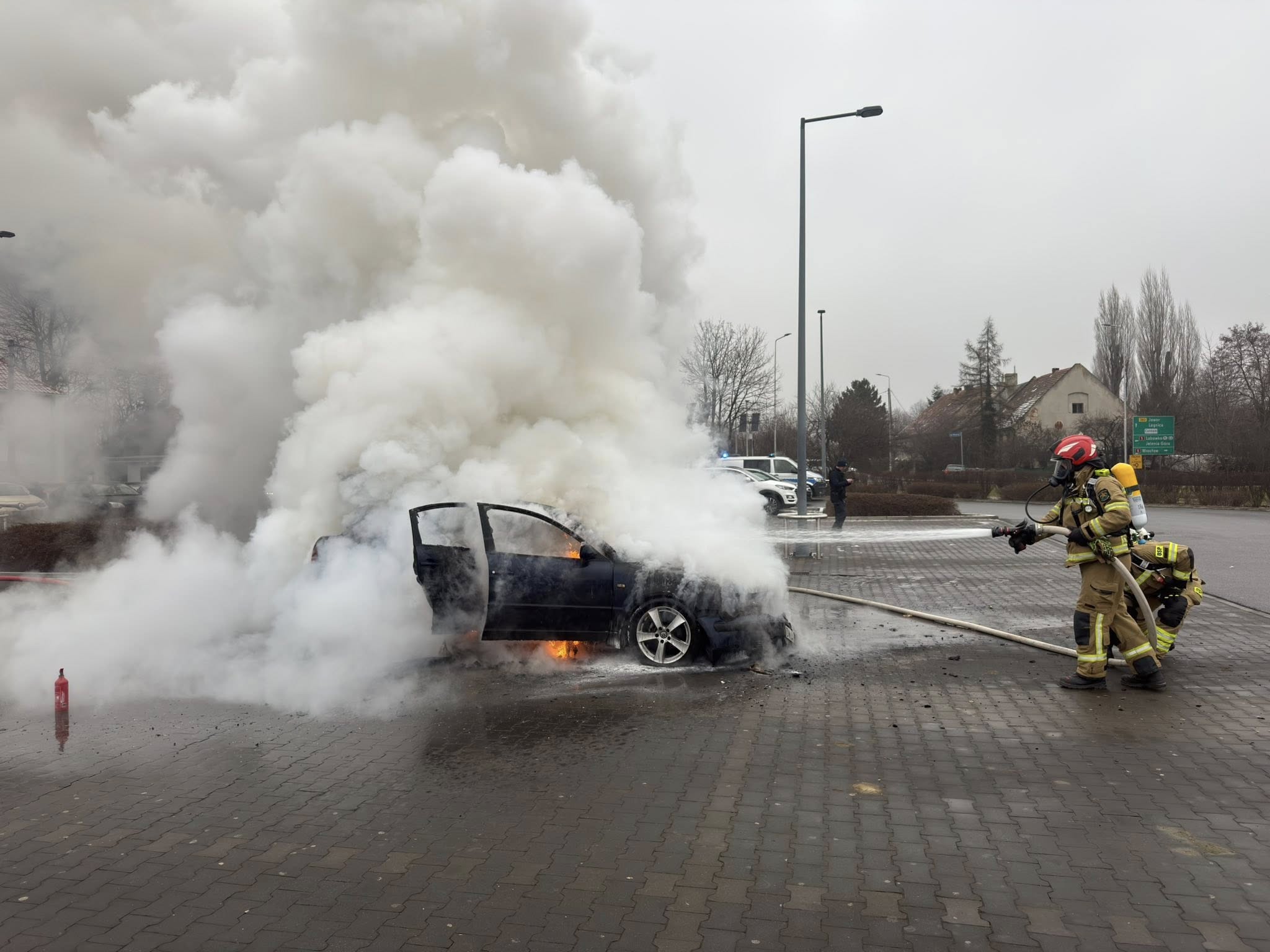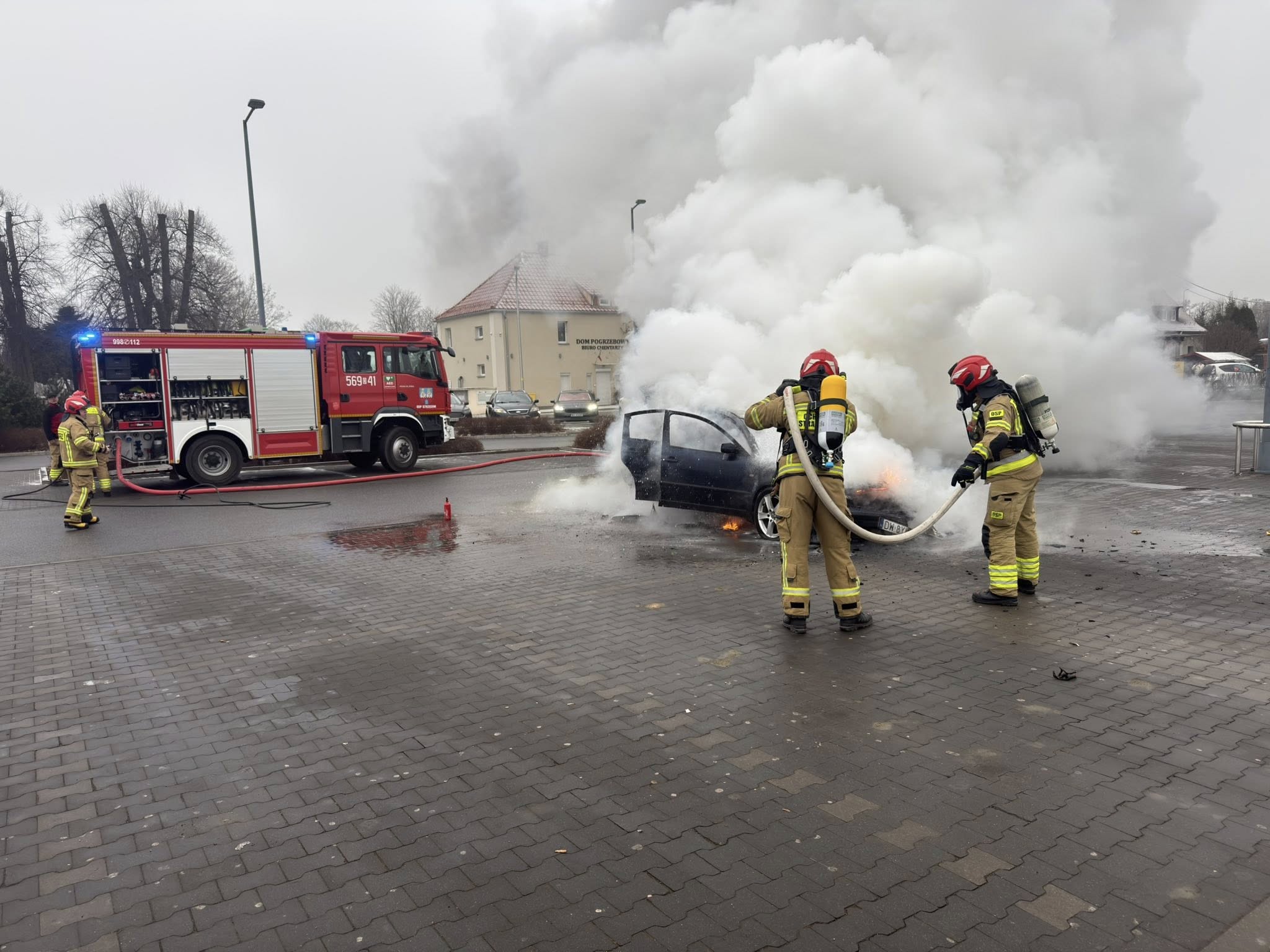 Dwa zastępy straży pożarnej brały udział w gaszeniu pożaru samochodu osobowego, który zapalił się na parkingu przed sklepem przy ul. Olszowej w Strzegomiu.
