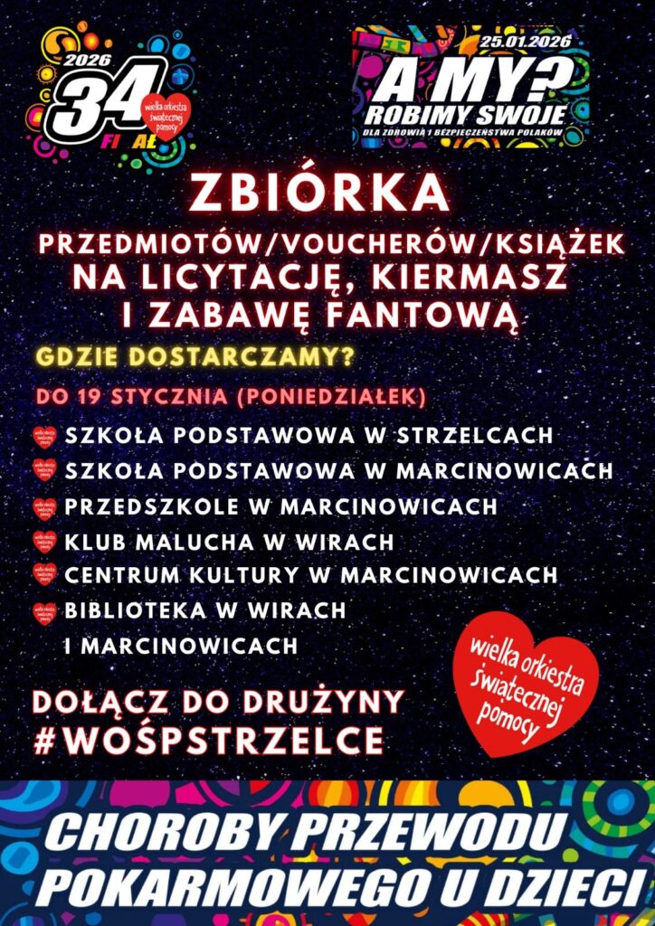 – Gramy, bo lubimy. Gramy, bo z Wami jak zawsze będzie ogień! Ogłaszamy zbiórkę voucherów, przedmiotów, książek, gadżetów na licytację, zabawę fantową i kiermasz. Gdzie dostarczamy? Szkoła Podstawowa im. Krzysztofa Kamila Baczyńskiego w Strzelcach, Szkoła Podstawowa im. Lotników Polskich w Marcinowicach, Publiczne Przedszkole Marcinowice, Klub Malucha w Wirach, Centrum Kulturalno-Biblioteczne w Marcinowicach, Biblioteka w Wiry i Marcinowice – wyliczają organizatorzy akcji w gminie Marcinowice.