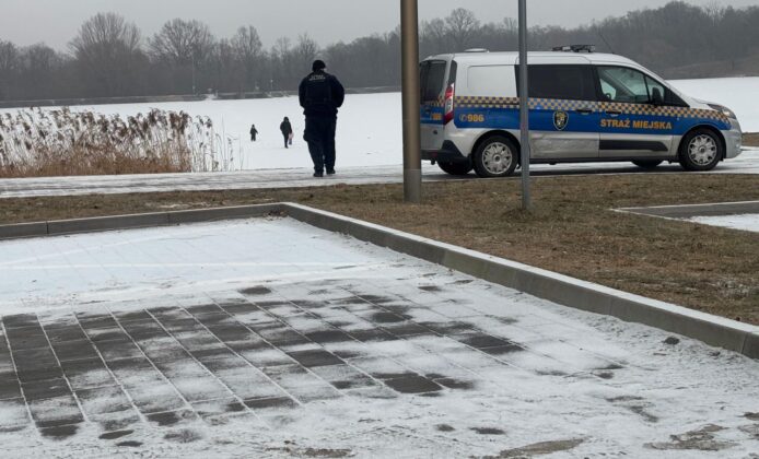 Strażnicy miejscy po raz kolejny interweniowali nad zalewem Witoszówka. Akwen jest skuty lodem, trudno jednak ocenić wytrzymałość pokrywy. – Za każdym razem apelujemy o rozsadek i uświadamiamy, że przechadzka może się źle skończyć – podkreśla dyżurny SM.