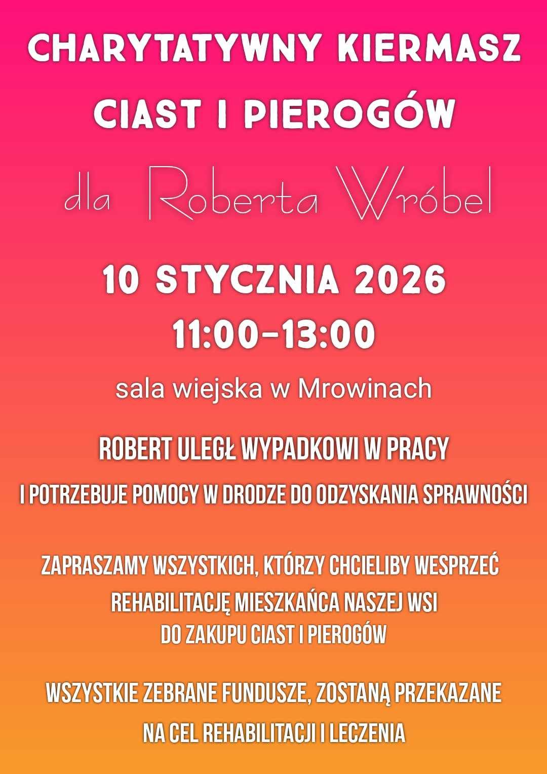 Na rehabilitację i dalsze leczenie jednego z mieszkańców Mrowin przeznaczone zostaną środki zebrane podczas charytatywnego kiermaszu ciast i pierogów, który organizuje lokalna społeczność.