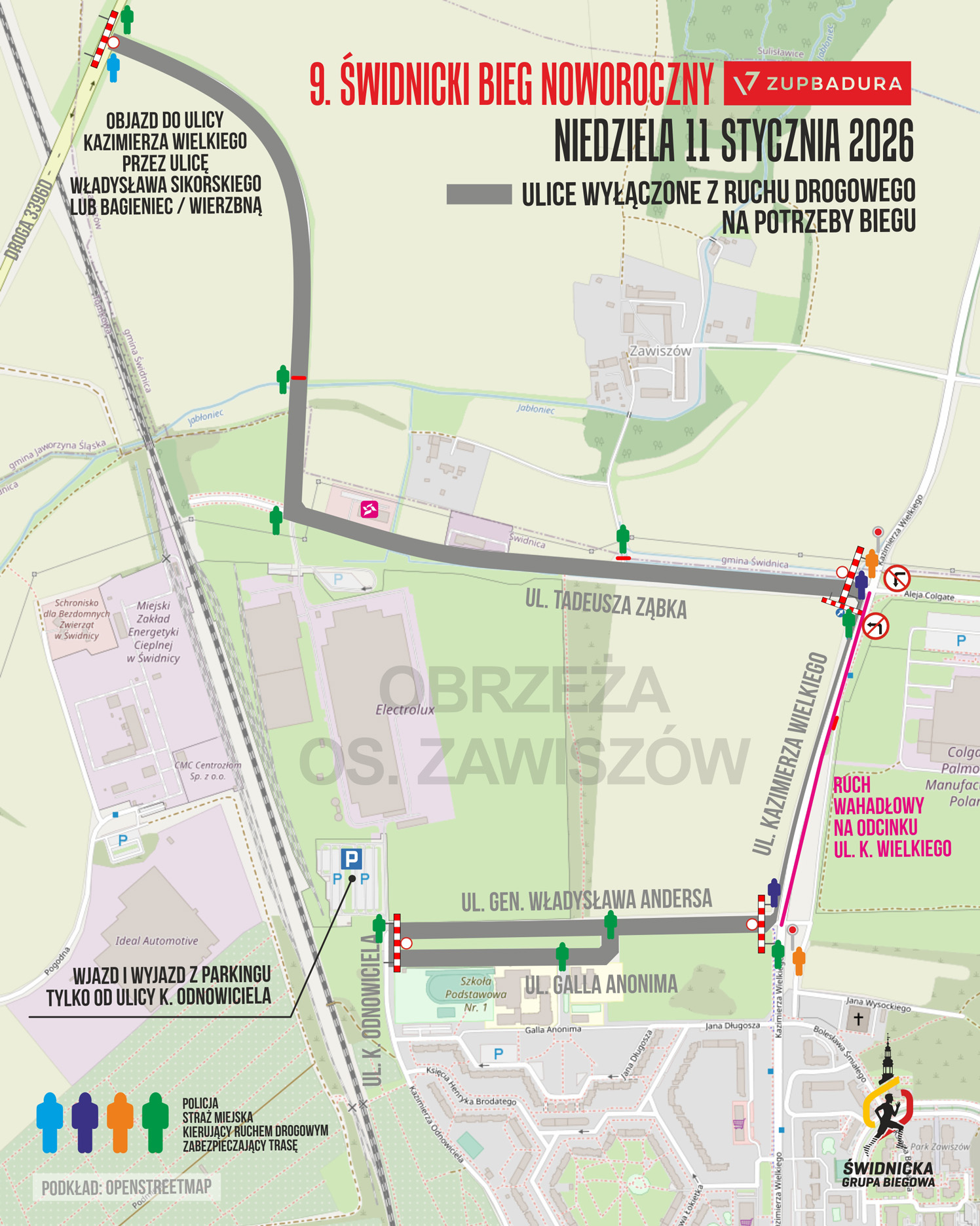 – Świdnicka Grupa Biegowa, organizator „9. Świdnickiego Biegu Noworocznego ZUPBADURA” informuje mieszkańców Świdnicy o czasowych utrudnieniach w ruchu drogowym, które mogą wystąpić w dniu 11 stycznia 2026 r. (niedziela) w godzinach 10:50-13:10 w obrębie ulic zlokalizowanych na obrzeżach Osiedla Zawiszów: ul. Galla Anonima (przy Hali Sportowej SP1), ul. Generała Władysława Andersa, ul. Kazimierza Wielkiego, ul. Tadeusza Ząbka oraz drogi łączącej ul. Tadeusza Ząbka z drogą 3396D (tzw. Łącznikiem) – czytamy w komunikacie organizatorów.