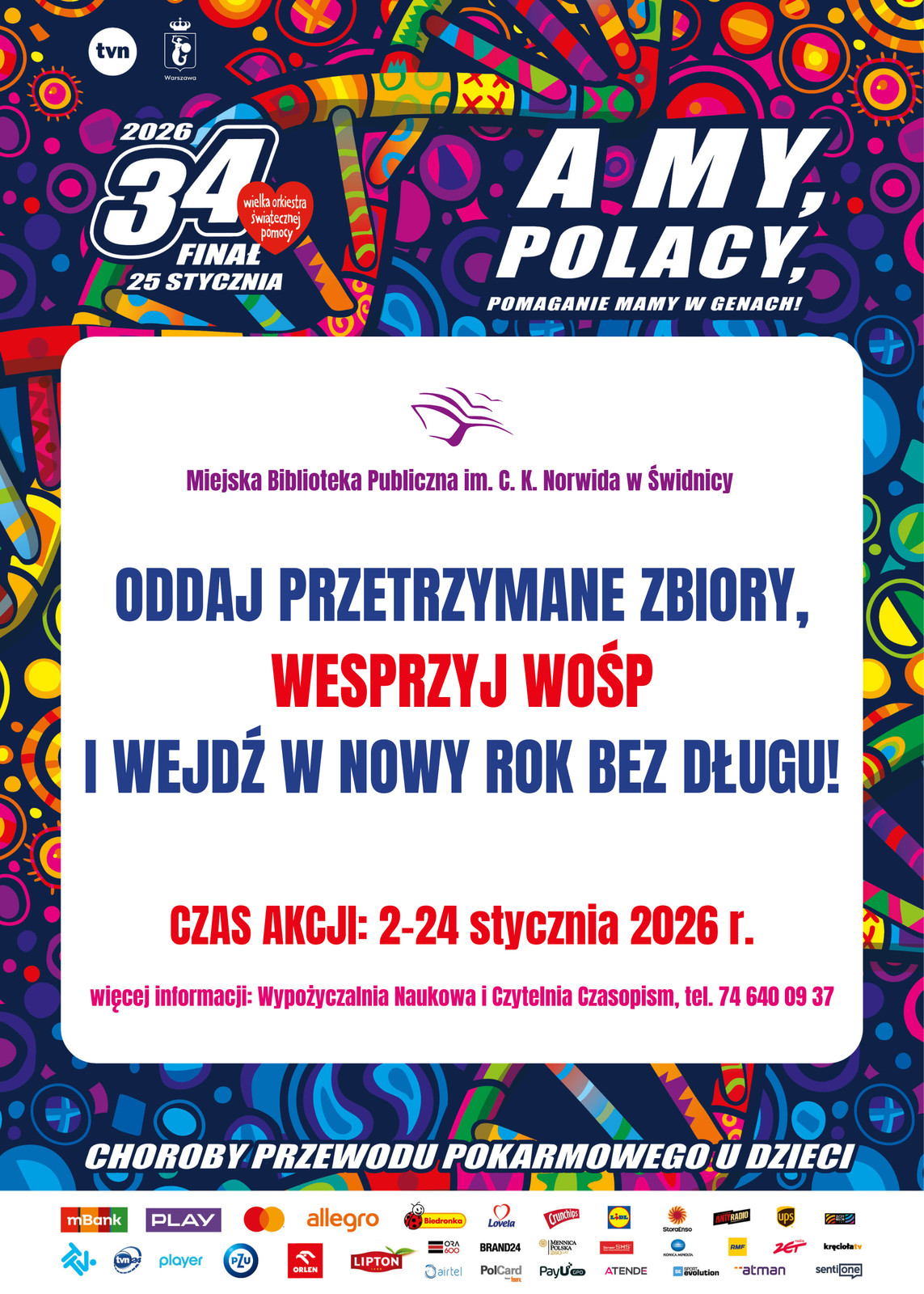 Wpłać datek na Wielką Orkiestrę Świątecznej Pomocy i wejdź w 2026 rok bez długu – zachęcają pracownicy Miejskiej Biblioteki Publicznej im. C. K. Norwida w Świdnicy, którzy zorganizowali specjalną akcję skierowaną do czytelników zalegających z oddaniem wypożyczonych książek.