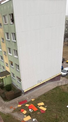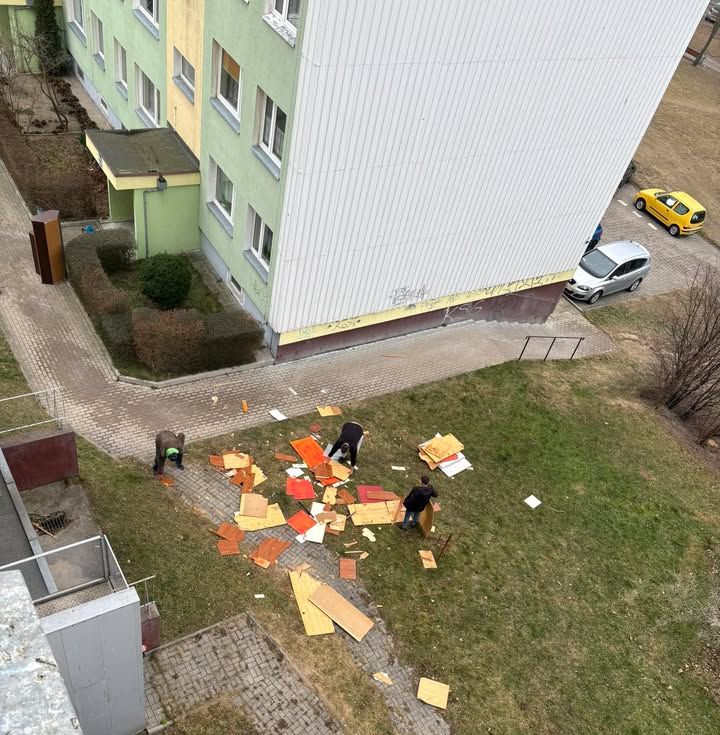 Na nagranym przez zaniepokojonego mieszkańca nagraniu widać, jak mężczyzna wychyla się z okna i wyrzuca kolejną deskę, która przez chwilę wiruje w powietrzu, by spaść na skwerek i na chodnik. Nie widać nikogo, kto na dole zabezpieczałby obszar, na który spadały płyty i ostrzegał przechodniów. Mężczyzna z okna nie mógł widzieć, czy ktoś nie nadchodzi lub nie nadjeżdża rowerem zza domu.