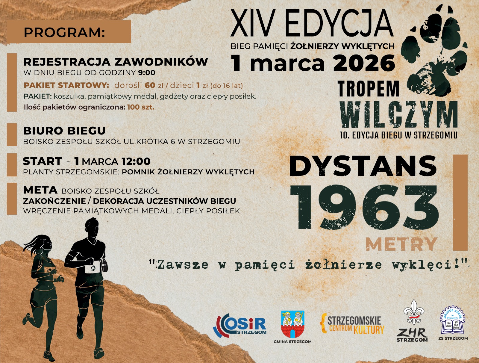 W Strzegomiu bieg pamięci Żołnierzy Wyklętych „Tropem Wilczym” wystartuje w niedzielę, 1 marca punktualnie o godzinie 12.00 spod pomnika Żołnierzy Wyklętych w parku Strzegomskie Planty. Zapisy na bieg będą prowadzone od godz. 9.00 w biurze zawodów na boisku Zespołu Szkół w Strzegomiu. Udział w biegu dla dzieci z gminy Strzegom do 16. roku kosztuje 1 zł za pakiet. Pozostałe osoby – kwota 60 zł. W pakiecie: koszulka techniczna, materiały reklamowe, pamiątkowy medal.