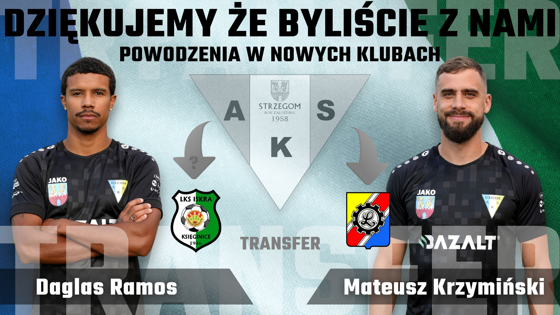 Z klubem z miasta granitu żegna się Mateusz Krzymiński. Po rundzie spędzonej w klubie ze Strzegomia przenosi się do Lechii Dzierżoniów. W barwach AKS wystąpił w rundzie jesiennej obecnego sezonu IV ligi w 13 spotkań ligowych. Strzegom opuszcza również Daglas Ramos. Zawodnikiem zainteresowany jest klub Iskra Księginice, a ewentualny transfer jest na etapie dopinania szczegółów. Brazylijski pomocnik rozegrał w barwach AKS-u rundę jesienną, notując 13 występów ligowych.
