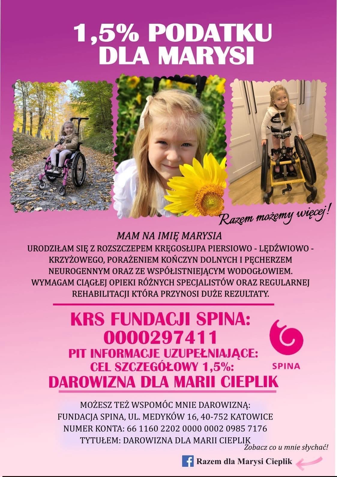 Wsparcie można okazać przekazując 1,5% podatku Fundacji Spina, której podopieczną jest Marysia, w formularzu PIT wpisując numer KRS 0000297411, natomiast w rubryce „Informacje uzupełniające – cel szczegółowy 1,5%” wpisując: „darowizna dla Marii Cieplik”. Naszą Marysię można również wesprzeć przekazując darowiznę na konto Fundacji Spina, ul. Medyków 16, 40-752 Katowice; numer konta: 66 1160 2202 0000 0002 0985 7176 tytułem „Darowizna dla Marii Cieplik”.