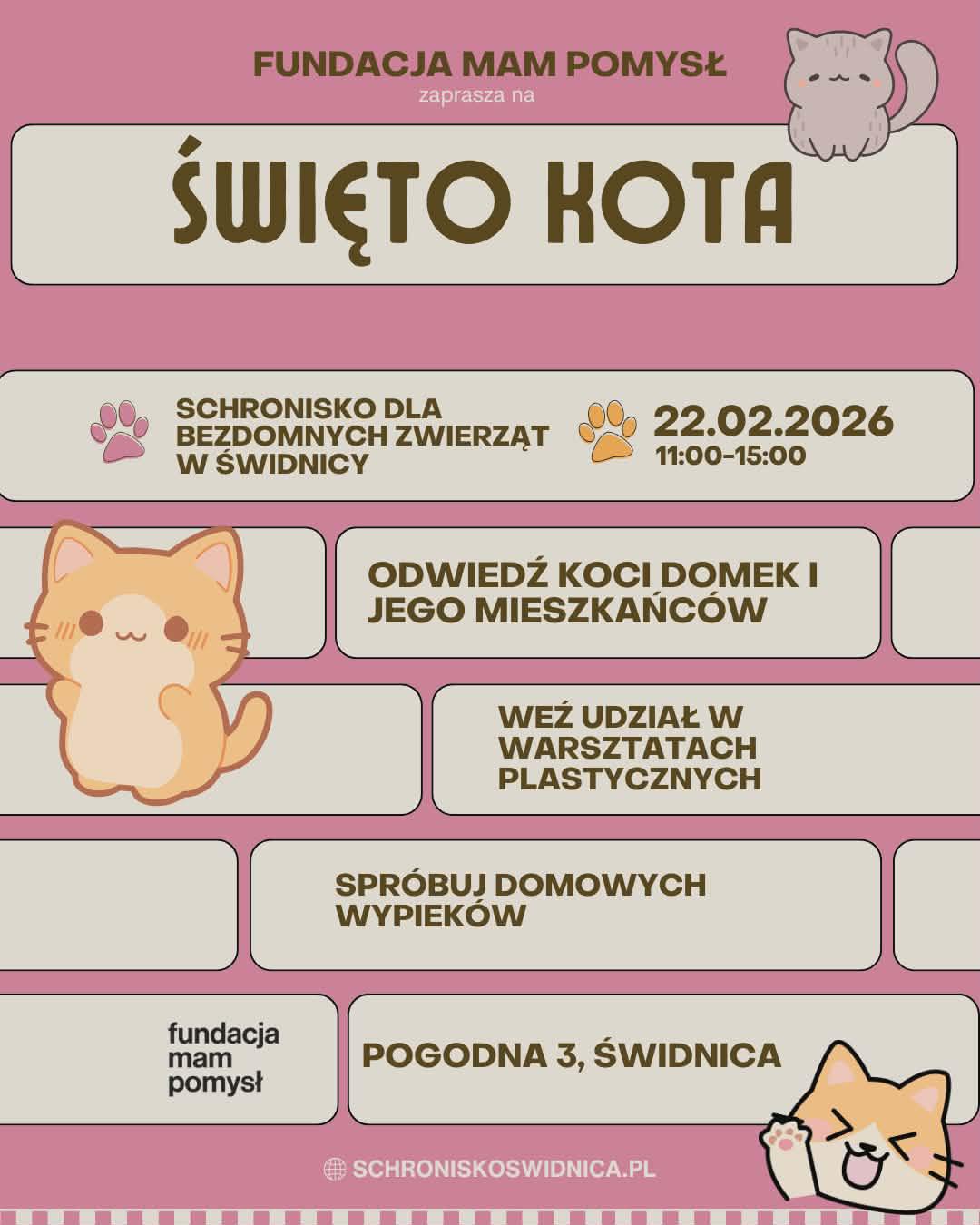 – 22 lutego zapraszamy serdecznie do schroniska przy ul. Pogodnej 3 w Świdnicy na dzień pełen kocich historii, spotkań i dobrej energii.