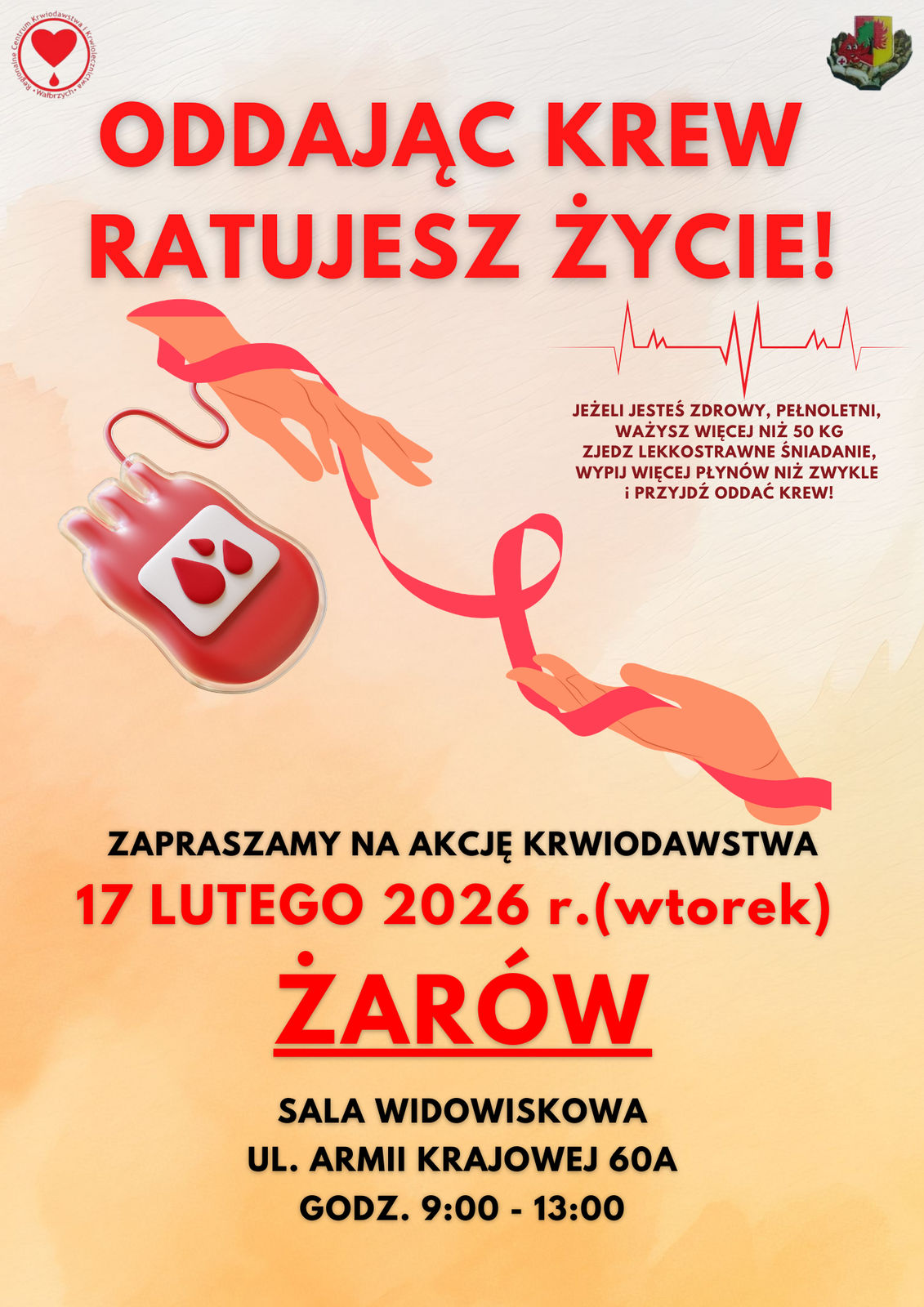 Krew będzie można oddawać we wtorek, 17 lutego, w godz. 9.00-13.00 w sali widowiskowo-sportowej przy ul. Armii Krajowej 60A w Żarowie.