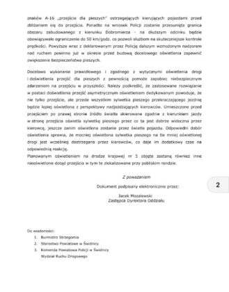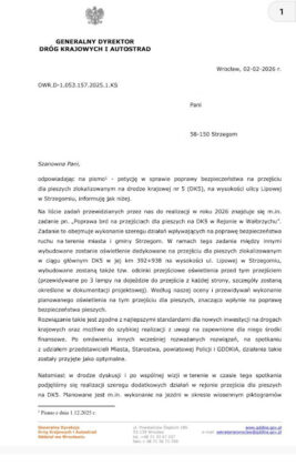 W piśmie podpisanym przez Jacka Mozalewskiego, zastępcę dyrektora wrocławskiego oddziału GDDKiA, wskazano, że w 2026 roku zrealizowane zostanie zadanie obejmujące budowę dedykowanego oświetlenia przejścia dla pieszych przy ul. Lipowej. Do czasu realizacji inwestycji wprowadzone mają zostać działania doraźne. Zaplanowano montaż piktogramów A-16 oraz wydłużenie obszaru zabudowanego od strony Dobromierza.