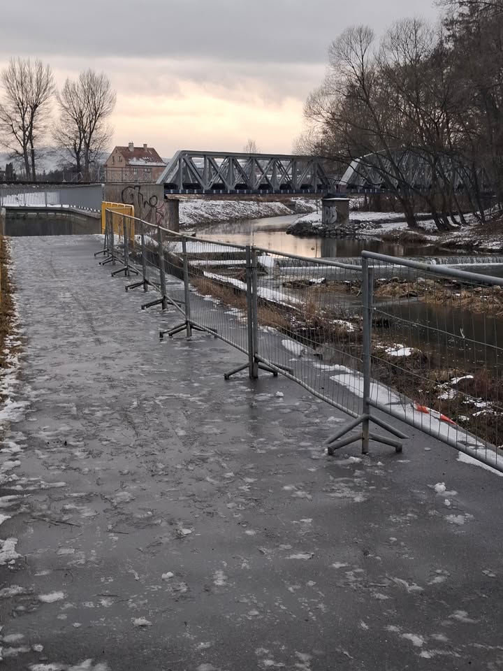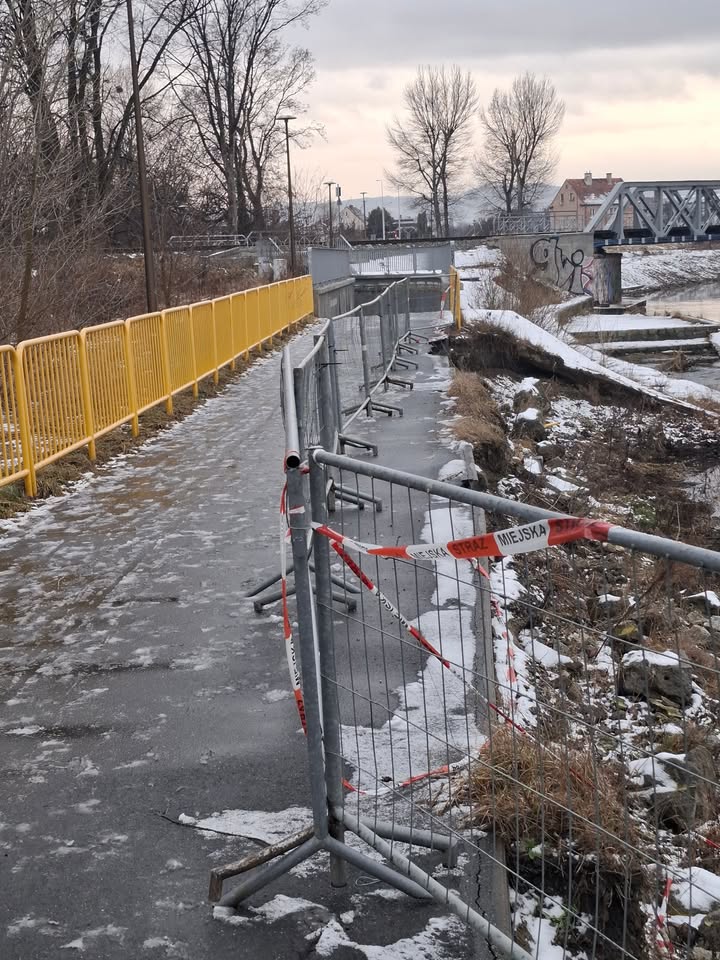 Od czasu powodzi podmyty fragment ścieżki na Alei Kolarskiej odgrodzony jest barierkami. 17 lutego służby miejskie zostały powiadomione, że ogrodzenie zostało wrzucone do koryta rzeki. Straż Miejska potwierdza, że tego samego dnia barierki zostały wyłowione i ustawione w pierwotnym miejscu.