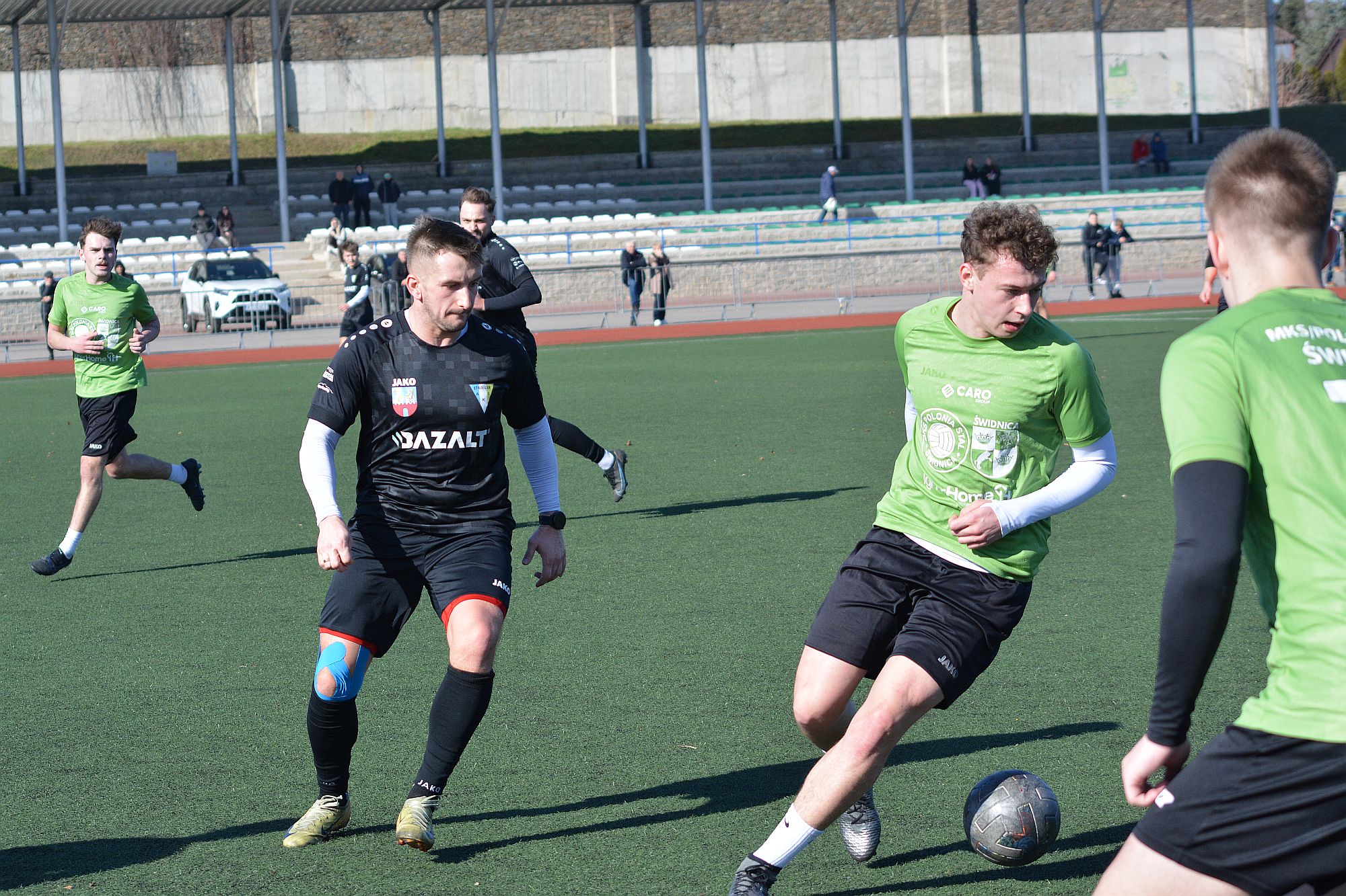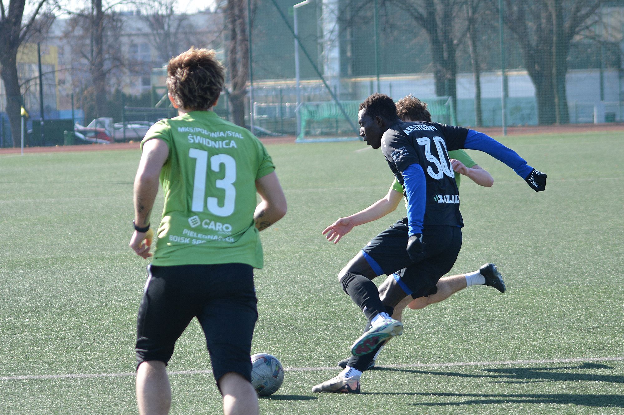 Pierwsza część gry należała do biało-zielonych. Wynik już w 5. minucie gry otworzył skutecznym uderzeniem z dystansu najmłodszych w świdnickim zespole, 17-letni Natan Dudek. Przyjezdni atakowali, byli głodni kolejnych trafień i co rusz naciskali na defensywę Strzegomian. Jeszcze w pierwszych 45 minutach ta sztuka udała się podopiecznym trenera Marcina Domagały dwukrotnie. Najpierw skuteczne podanie od Miłosza Taranka wykorzystał Mateusz Mojka, a następnie Mojka pokonał jeszcze bramkarza AKS-u w sytuacji jeden na jednego. Do przerwy było zatem 3:0 dla świdnickiego zespołu.