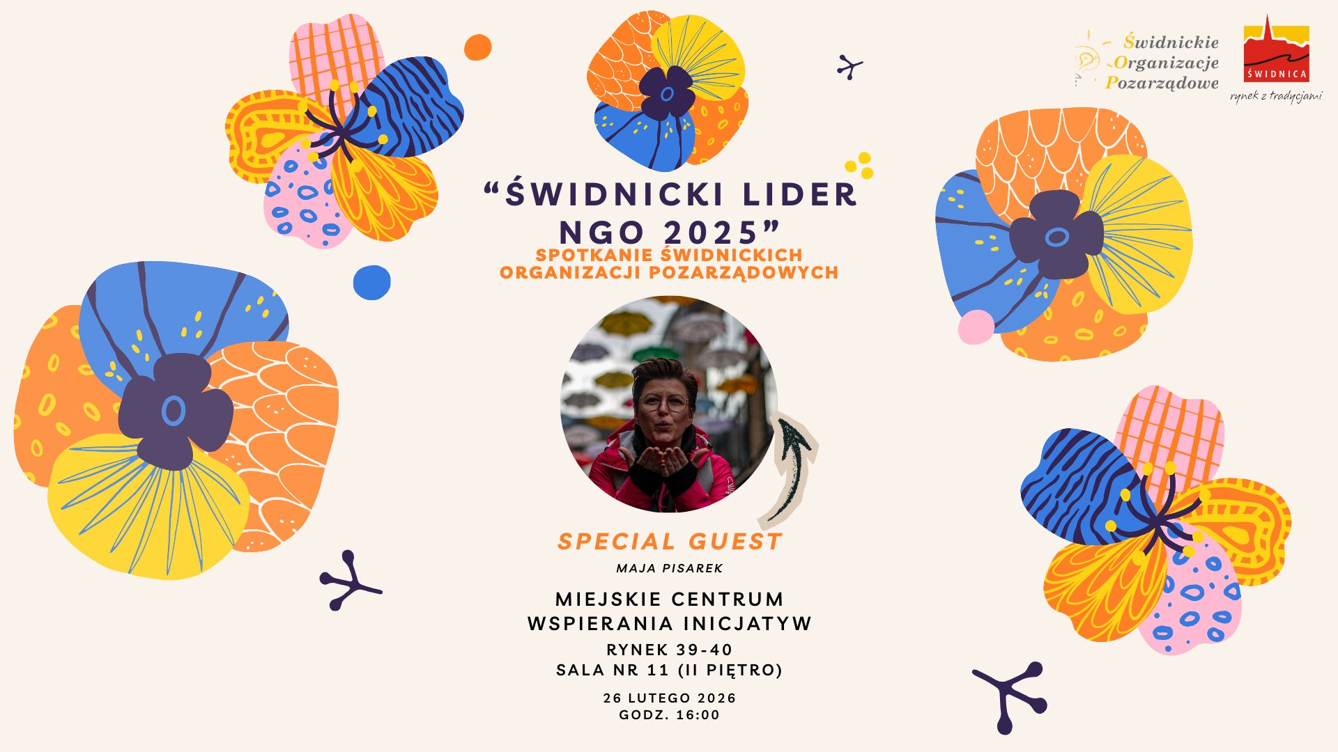 Z okazji Światowego Dnia Organizacji Pozarządowych nastąpi wręczenie nagród dla świdnickich organizacji wyróżniających się zaangażowaniem oraz pracą na rzecz Świdnicy i jej mieszkańców. Gościem specjalnym wydarzenia będzie Maja Pisarek – psycholog i mentorka wspierająca liderów oraz osoby zaangażowane społecznie.