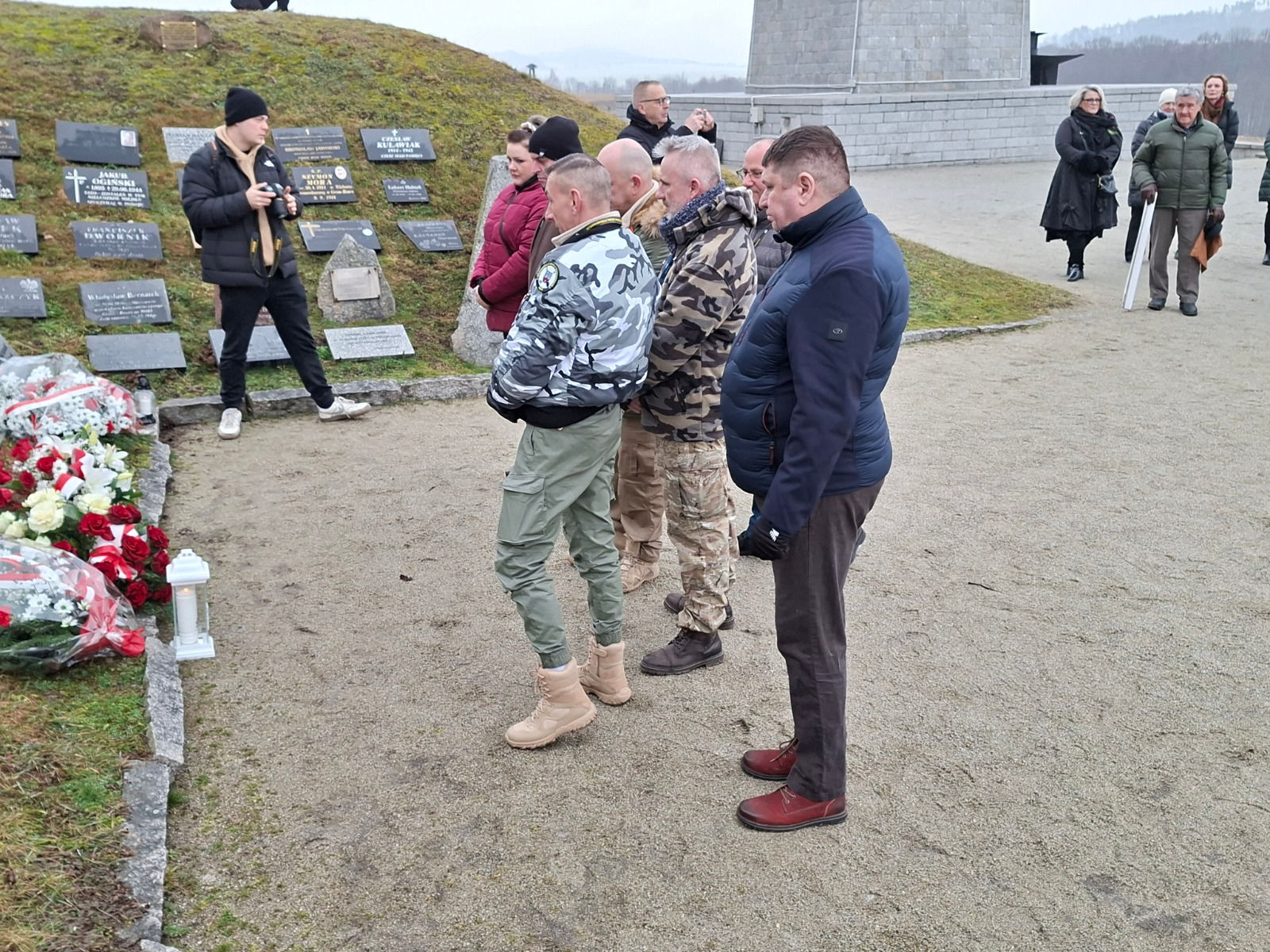 Przy historycznej „ścianie śmierci” uczestnicy wysłuchali wystąpień dr hab. Doroty Suli oraz przewodniczącego Rady Miejskiej w Strzegomiu Piotra Szmidta. Następnie przybyłe delegacje złożyły kwiaty i znicze pod tablicą upamiętniającą ofiary tragicznej ewakuacji.