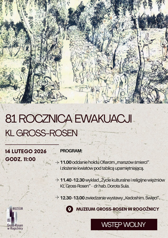 14 lutego o godz. 11.00 na terenie Muzeum Gross-Rosen w Rogoźnicy ofiarom tragedii sprzed 81 lat zostanie oddany hołd. O godz. 11.40 będzie można wysłuchać wykładu dr hab. Doroty Suli „Życie kulturalne i religijne więźniów KL Gross-Rosen’’ , a o 12.30 zwiedzić wystawę ,,Kedoshim. Święci’’.