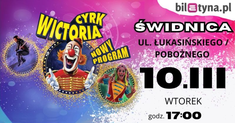 Bilety dostępne w kasie cyrku w dniu programu od godziny 10.00 oraz na stronie: https://biletyna.pl/cyrk/Cyrk-Wictoria/Swidnica