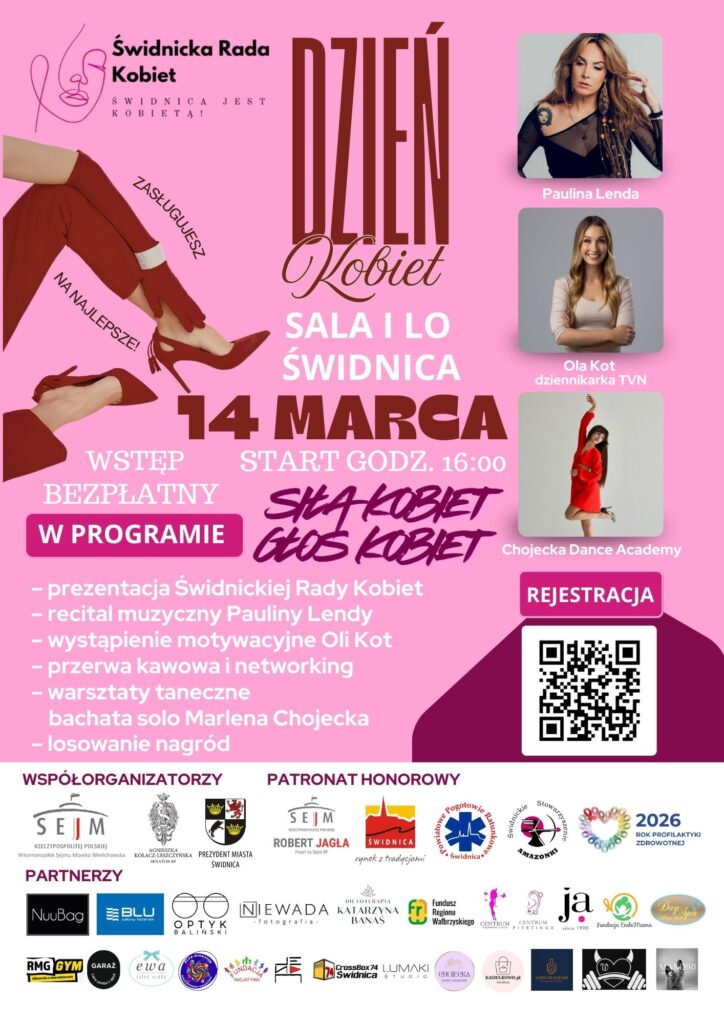 Wstęp na wydarzenie jest bezpłatny, jednak z uwagi na ograniczoną liczbę miejsc obowiązuje wcześniejsza rejestracja za pomocą kodu QR dostępnego na plakatach lub na stronie: https://naszbiznes24.pl/swidnicki-dzien-kobiet-14-03-2026.