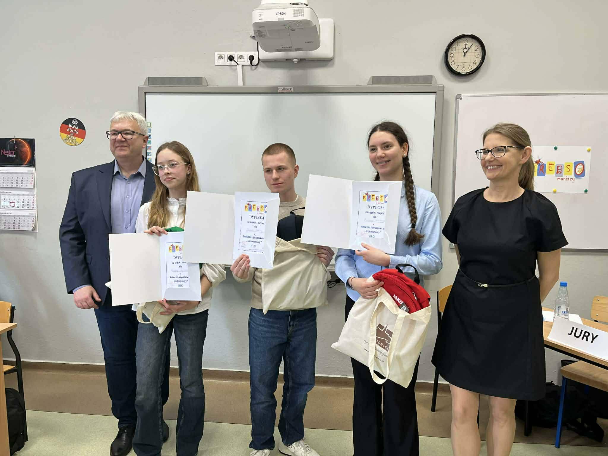 Po obliczeniu wszystkich punktów jury ogłosiło zwycięzców, a później dyrektor Jacek Iwancz wręczył nagrody i dyplomy. Zadania konkursowe ułożyły nauczycielki II LO: germanistka Aleksandra Królak – Wąsowicz, polonistka Elżbieta Badzioch – Zarzycka i anglistka Adrianna Górka –Sawko, a o dekoracje zadbała Marta Kurzawa wraz z uczniami klasy 2b, którzy opiekowali się drużynami i prowadzili zawody.