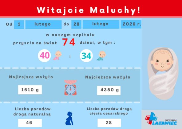 W lutym 2026 roku w świdnickim szpitalu Latawiec na świat przyszło 74 dzieci: 40 dziewczynek i 34 chłopców. Najlżejsze dziecko ważyło 1610g, a najcięższe – 4350g. Liczba porodów drogą naturalną wyniosła 46, a liczba porodów drogą cesarskiego cięcia 28 – wyliczają medycy z Samodzielnego Publicznego Zespołu Opieki Zdrowotnej w Świdnicy.