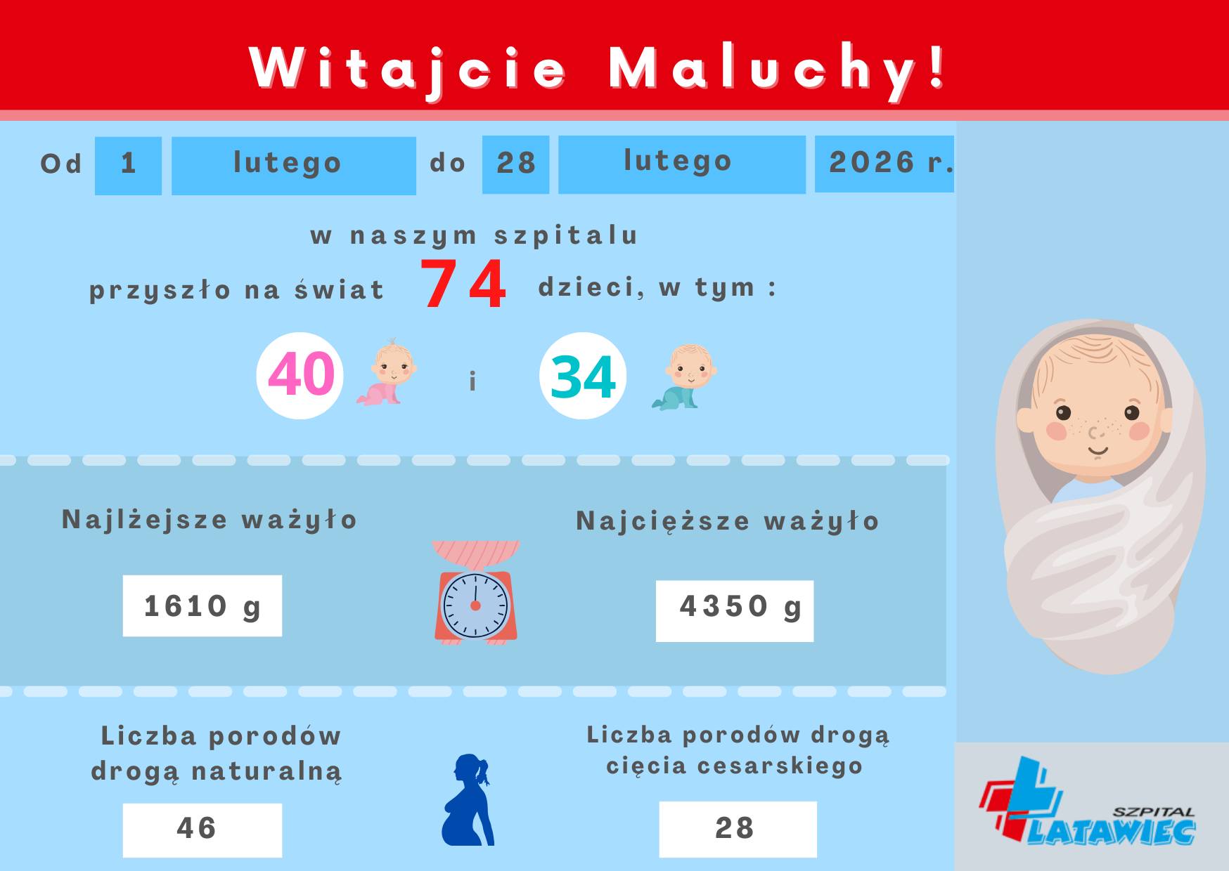Od 1 do 28 lutego 2026 roku w Regionalnym Szpitalu Specjalistycznym „Latawiec” w Świdnicy na świat przyszło 74 dzieci.