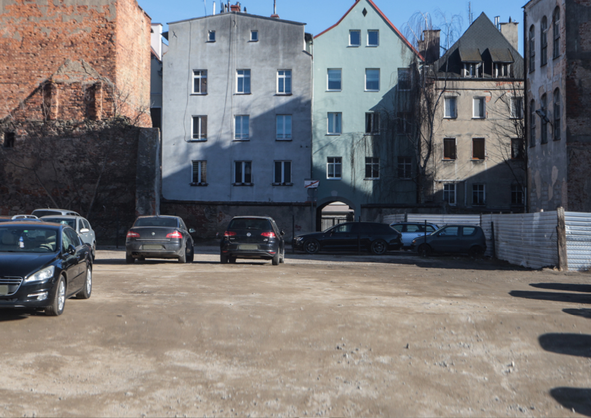 Widok od podwórza z dawnego boiska Szkoły Podstawowej nr 1 na kamienice Trybunalska nr 8, 10 i 12. Po prawej stronie fragment gmachu szkoły.