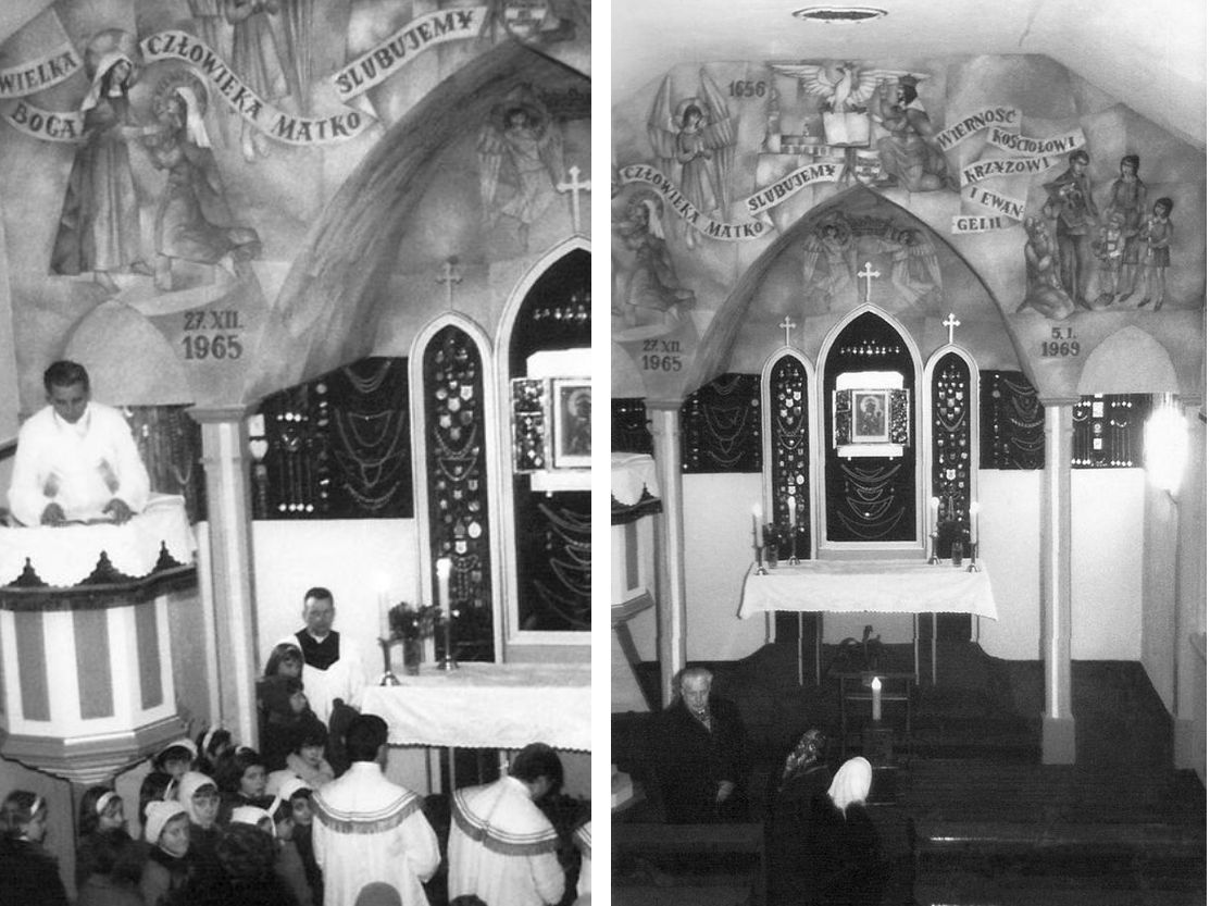 Instalacja obrazu 12 stycznia 1969 roku, fot. pochodzi z B. Świżewska „Ksiądz Jan Czajka i jego parafia pw. św. Józefa Oblubieńca NMP w Jaworzynie Śląskiej„, 2007; za historia. sokibp.net