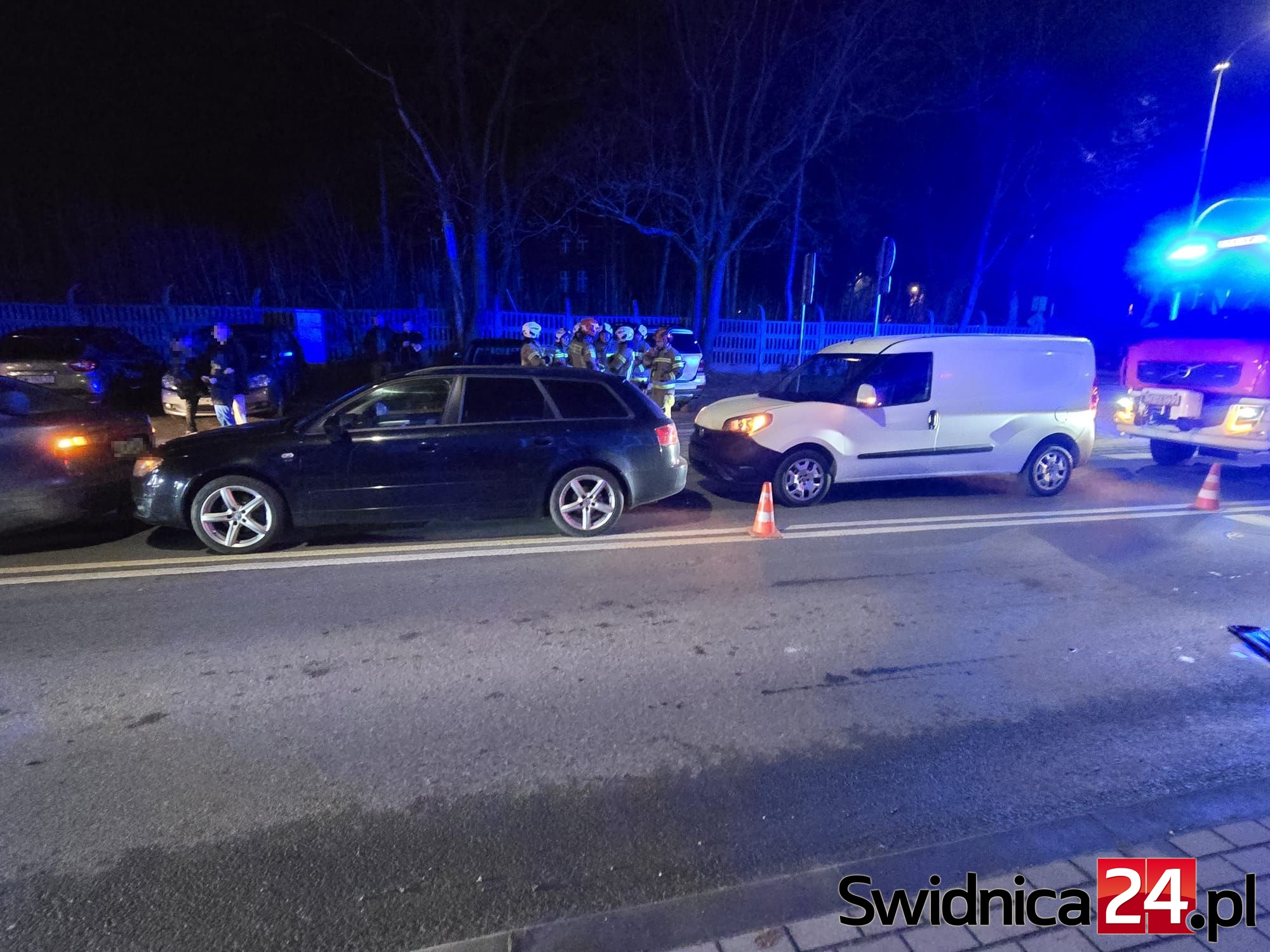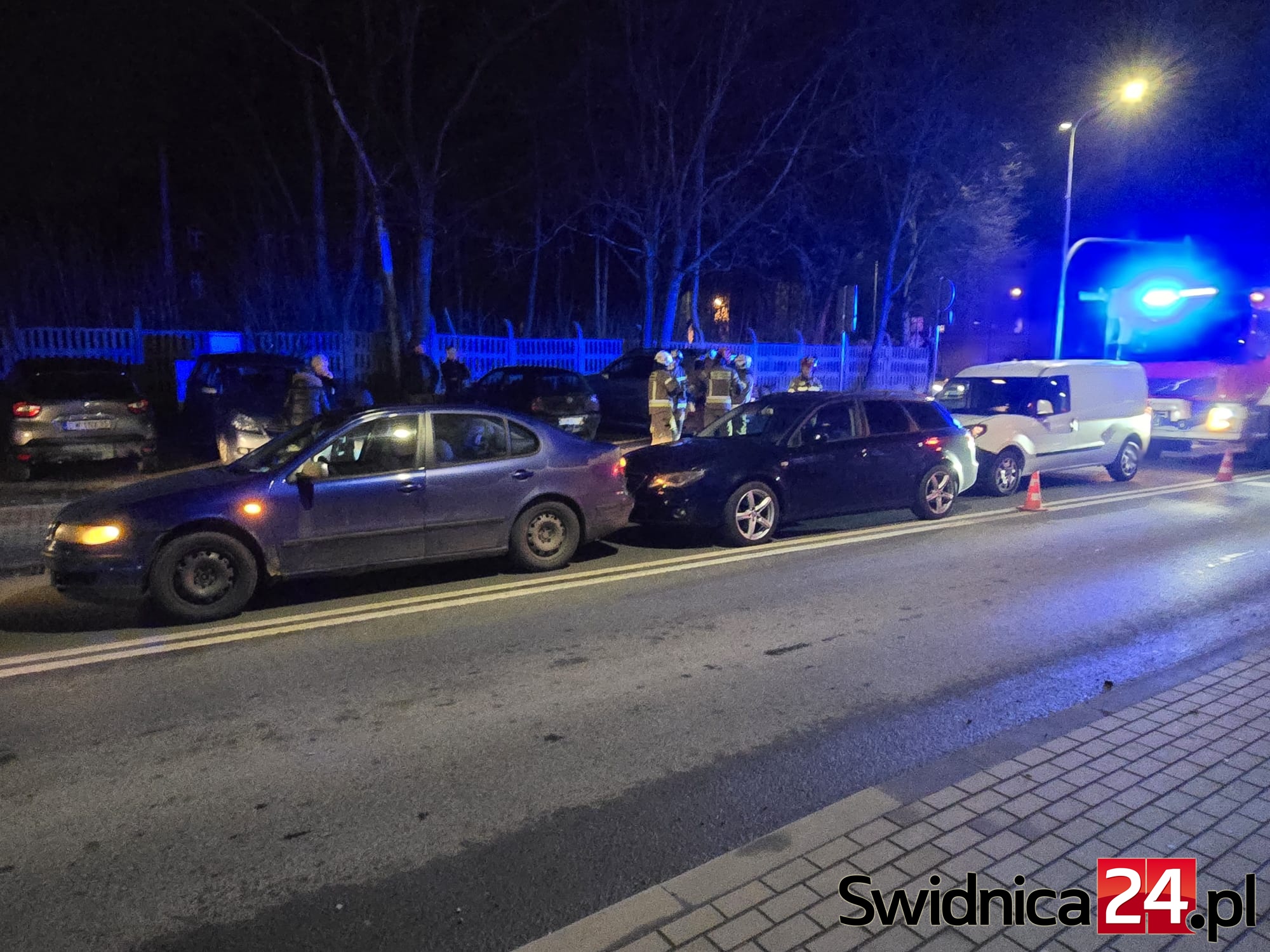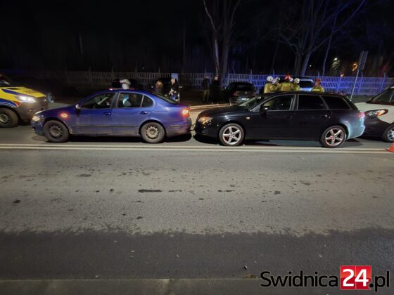 Służby zostały zaalarmowane 12 marca o godz. 19.11. Doszło do zderzenia dwóch samochodów marki Seat i Fiata. – Doszło do najechania na tył. Nikt nie odniósł poważnych obrażeń, osoby, które uskarżały się na ból kręgosłupa i szyi są badane przez zespół pogotowia ratunkowego – informuje bryg. Łukasz Grzelak z KP PSP w Świdnicy. W wyniku zderzenia doszło do wycieków płynów samochodowych na jezdnię.