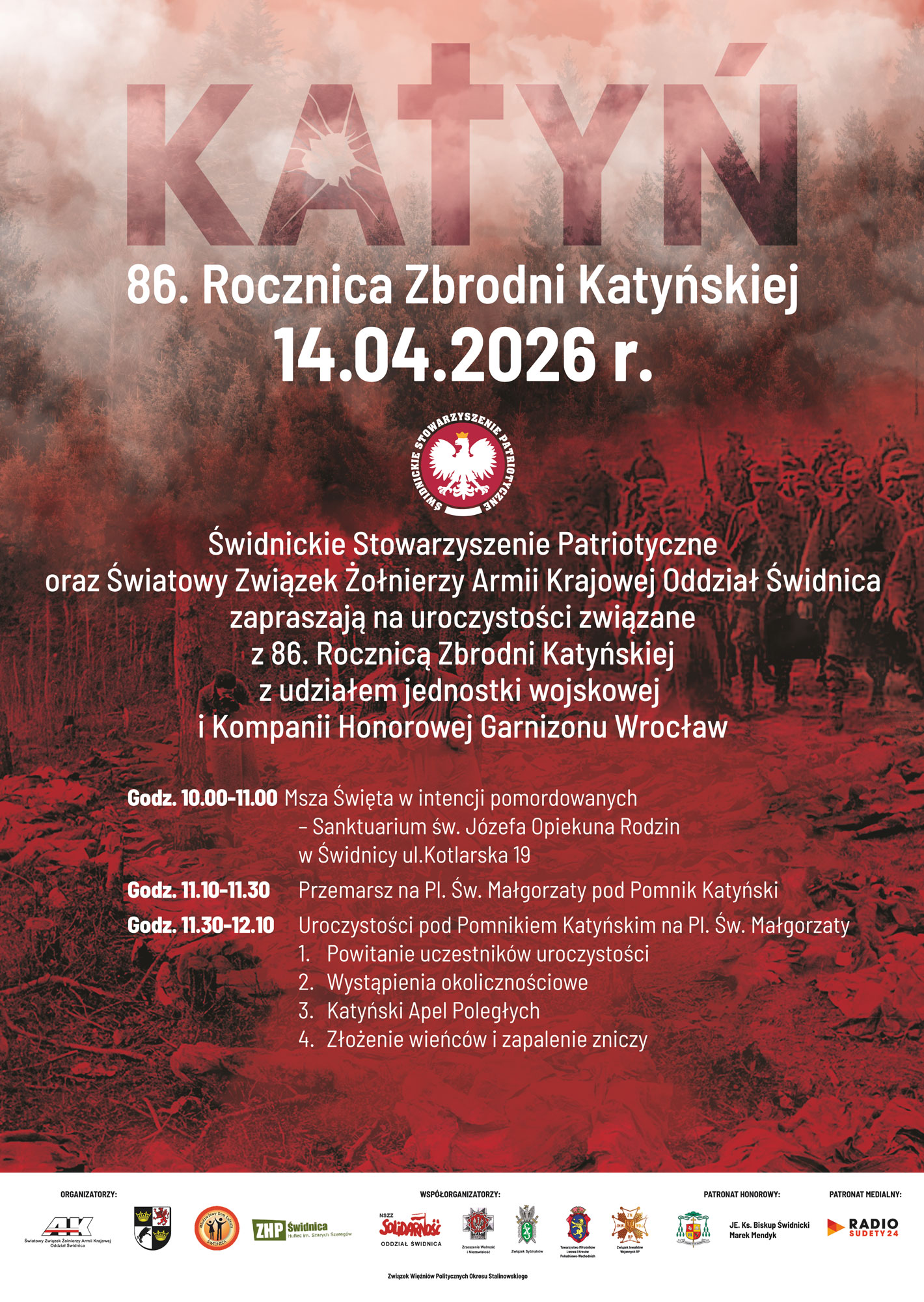 Od wielu lat z inicjatywy Świdnickiego Stowarzyszenia Patriotycznego oraz Światowego Związku Żołnierzy Armii Krajowej w Świdnicy wspominane są ofiary zbrodni katyńskiej. Uroczystości w 86. rocznicę mordu rozpoczną się 14 kwietnia o godzinie 10.00 mszą św. w świdnickim Sanktuarium pw. św. Józefa Opiekuna Rodzin. Po nabożeństwie uczestnicy wspólnie z Kompanią Honorową Garnizonu Wrocław przemaszerują na Plac św. Małgorzaty.