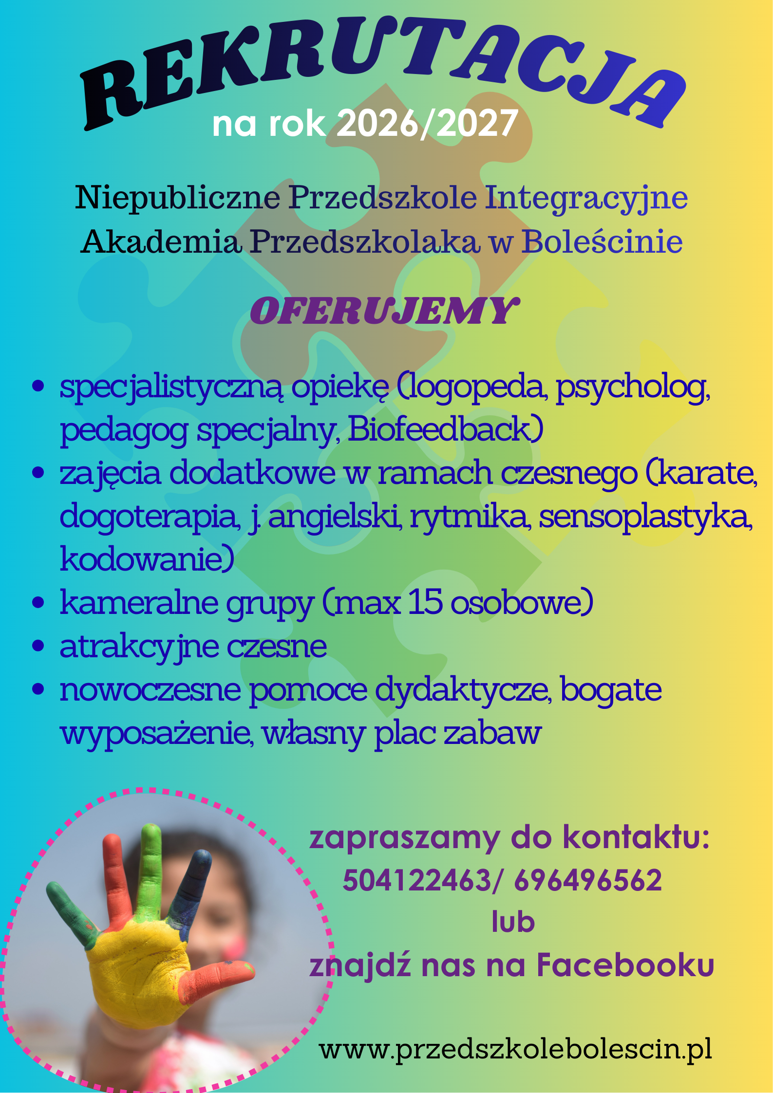 Niepubliczne Przedszkole Integracyjne „Akademia Przedszkolaka” w Boleścinie prowadzi nabór na rok szkolny 2026/2027. Placówka działa pod opieką Fundacji Infinitum, stawiamy na integrację dzieci o różnych potrzebach, w szczególności dzieci posiadających orzeczenia o potrzebie kształcenia specjalnego.
