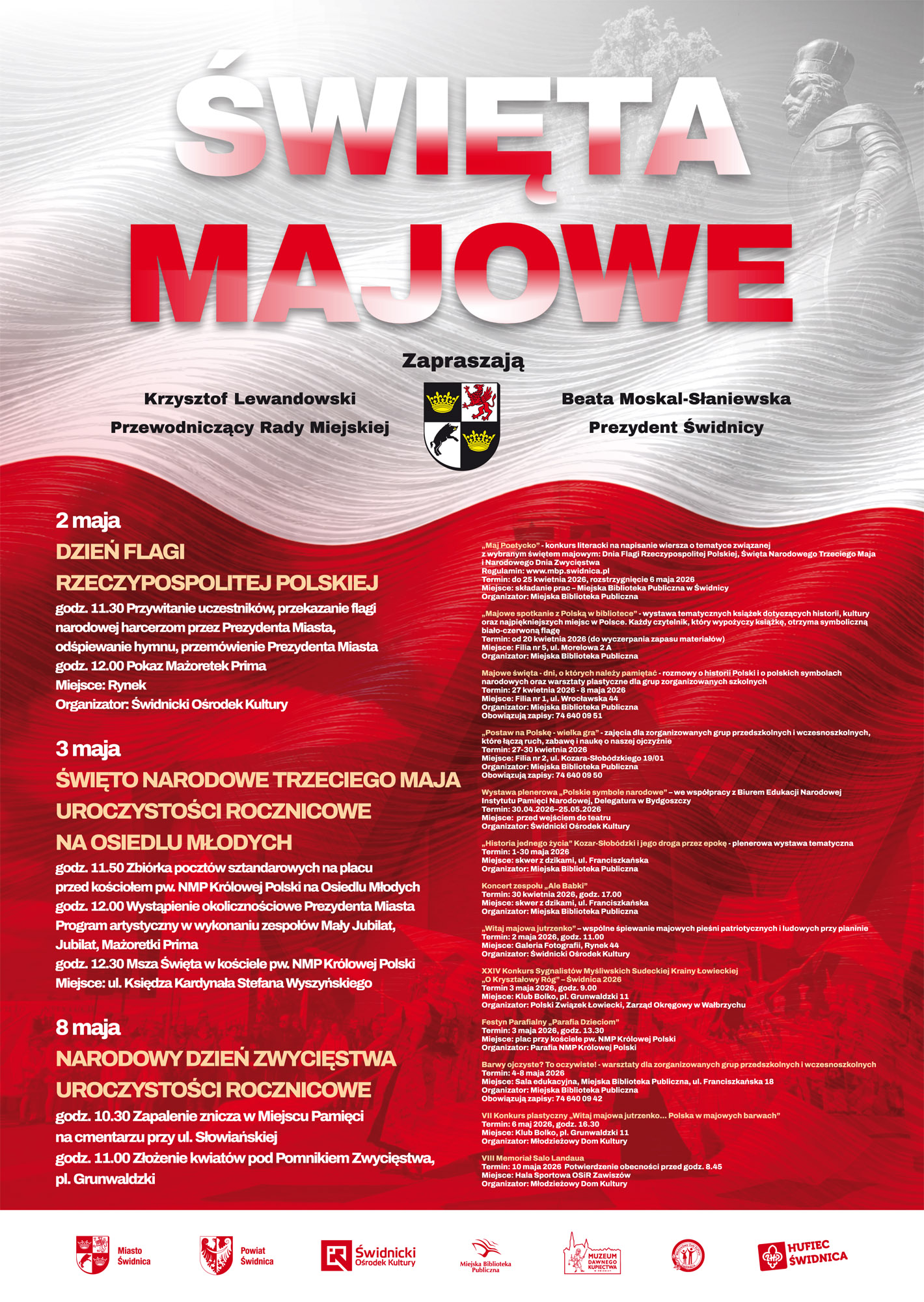 – Tegoroczne Święta Majowe to bogaty program uroczystości patriotycznych, koncertów, konkursów, wystaw, warsztatów i spotkań przygotowanych przez miejskie instytucje oraz partnerów wydarzenia. W programie znalazły się oficjalne obchody Dnia Flagi Rzeczypospolitej Polskiej, Święta Narodowego Trzeciego Maja oraz Narodowego Dnia Zwycięstwa, a także liczne propozycje dla dzieci, młodzieży, rodzin i seniorów. Nie zabraknie muzyki, aktywności edukacyjnych, wydarzeń plenerowych oraz inicjatyw promujących wiedzę o Polsce i jej symbolach narodowych – zapowiada Magdalena Dzwonkowska, rzecznik świdnickiego magistratu.