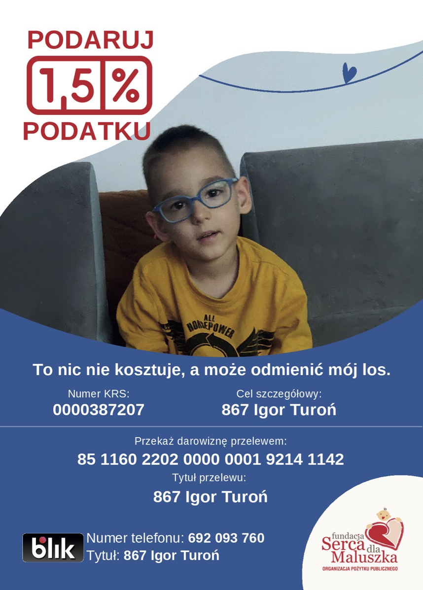 Igor Turoń jest podopiecznym Fundacji „Serca dla Maluszka”. Aby przekazać 1,5% podatku podczas wypełniania zeznania podatkowego w polu numer KRS należy wpisać: „0000387207”, a w celu szczegółowym podać: „867 Igor Turoń”.