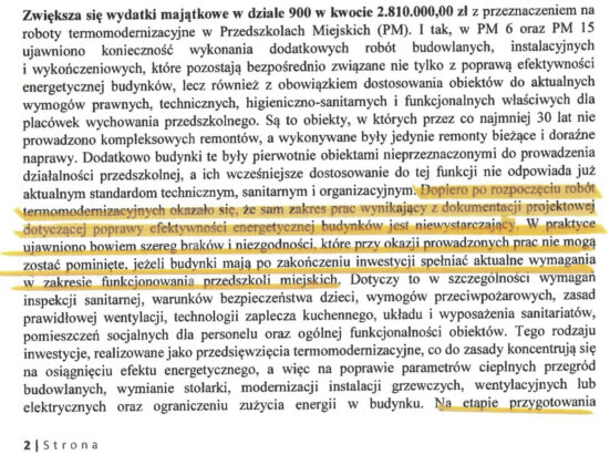 Łączne nakłady finansowe na wykonanie prac w miejskich przedszkolach miały wynieść blisko 17 mln 53 tys. złotych. Podobnie jednak, jak w przypadku termomodernizacji gmachu Urzędu Miejskiego i Urzędu Stanu Cywilnego, a także przebudowy wnętrza teatru miejskiego, po rozpoczęciu robót okazało się, że konieczne jest rozszerzenie zakresu inwestycji o dodatkowe prace, które są „niezbędne dla zapewnienia zgodności obiektów z obowiązującymi przepisami, bezpieczeństwa użytkowników oraz możliwości dalszego funkcjonowania przedszkoli”. Na ten cel potrzeba dodatkowo 2 mln 810 tys. złotych.