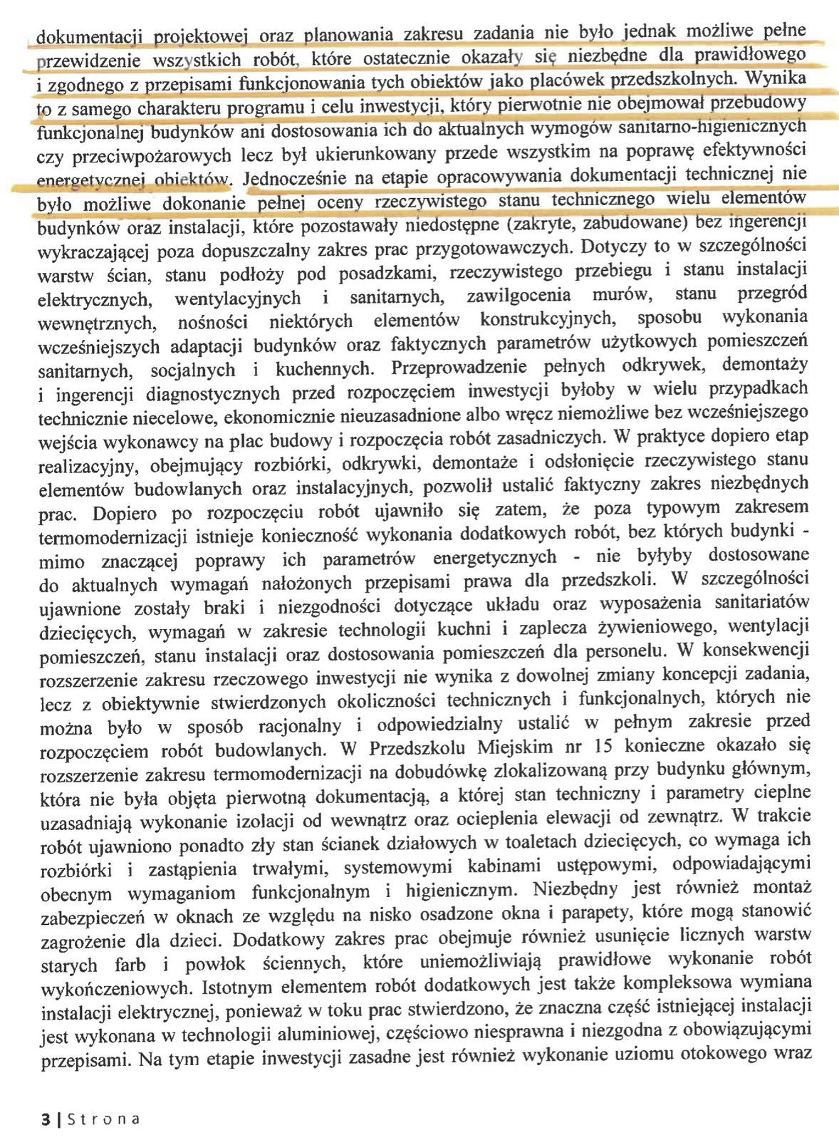 Po rozpoczęciu robót okazało się, że zakres prac wynikający z dokumentacji projektowej jest niewystarczający, a rzeczywisty stan techniczny obiektów ujawnił liczne braki i niezgodności, których nie było możliwe w pełni przewidzieć na etapie przygotowania inwestycji. Dotyczy to m.in. instalacji, przegród budowlanych, sanitariatów, wentylacji, zaplecza kuchennego oraz pomieszczeń socjalnych. W związku z tym konieczne stało się rozszerzenie zakresu prac o roboty niezbędne do zapewnienia zgodności z przepisami oraz prawidłowego funkcjonowania placówek – wskazują.