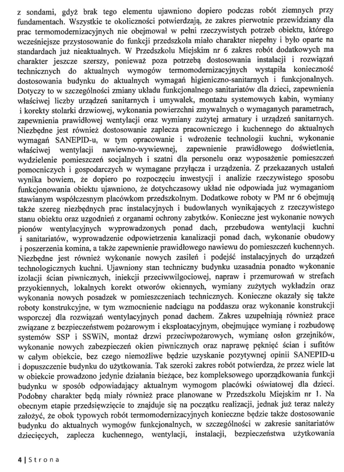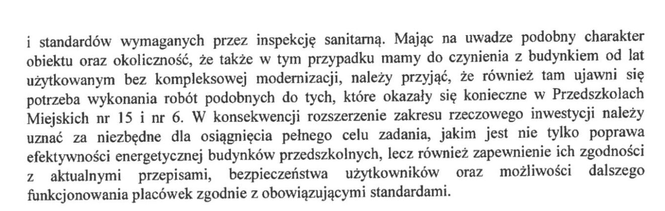 W Przedszkolu Miejskim nr 15 zakres robót rozszerzono m.in. o termomodernizację dobudówki, wymianę ścianek w sanitariatach, montaż zabezpieczeń okien, usunięcie starych powłok ściennych oraz wymianę instalacji elektrycznej i wykonanie uziemienia. W Przedszkolu Miejskim nr 6 zakres robót dodatkowych obejmuje w szczególności przebudowę sanitariatów, dostosowanie zaplecza kuchennego i pracowniczego do wymogów SANEPID-u, wykonanie właściwej wentylacji, prace instalacyjne i budowlane, w tym izolacje, naprawy konstrukcyjne oraz roboty związane z bezpieczeństwem pożarowym i eksploatacyjnym. Podobny zakres prac przewiduje się również w Przedszkolu Miejskim nr 1, gdzie na obecnym etapie realizacji należy uwzględnić konieczność dostosowania obiektu do aktualnych wymogów – wyliczają miejscy urzędnicy.