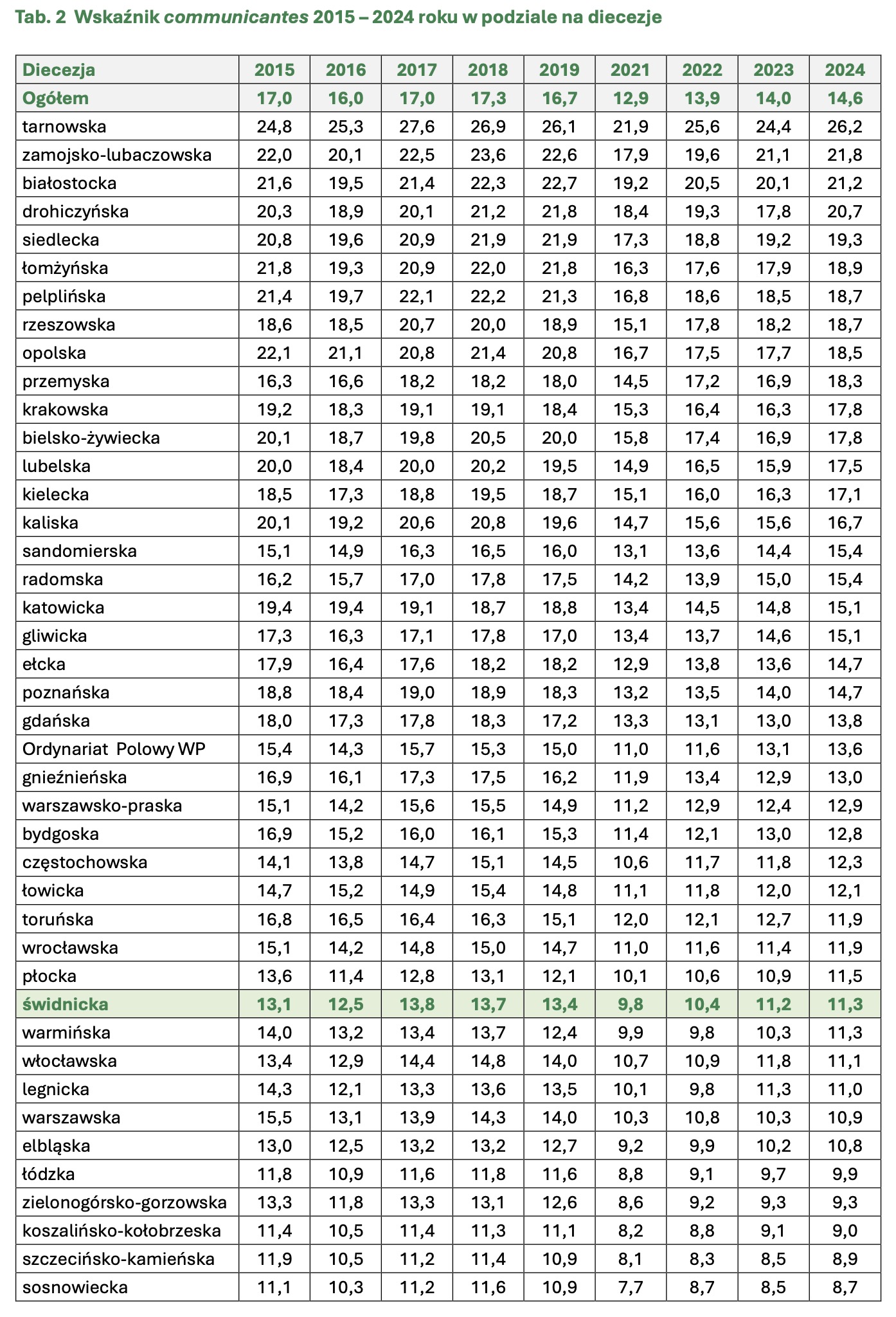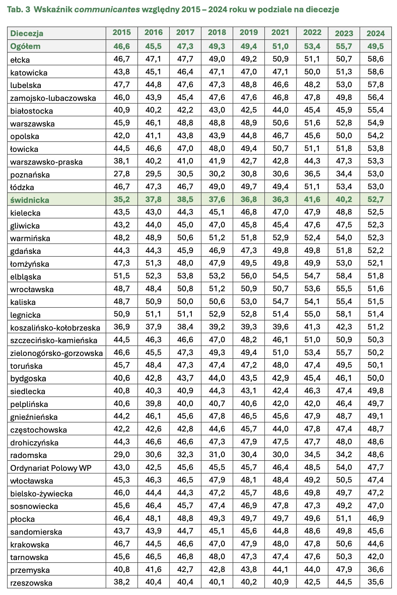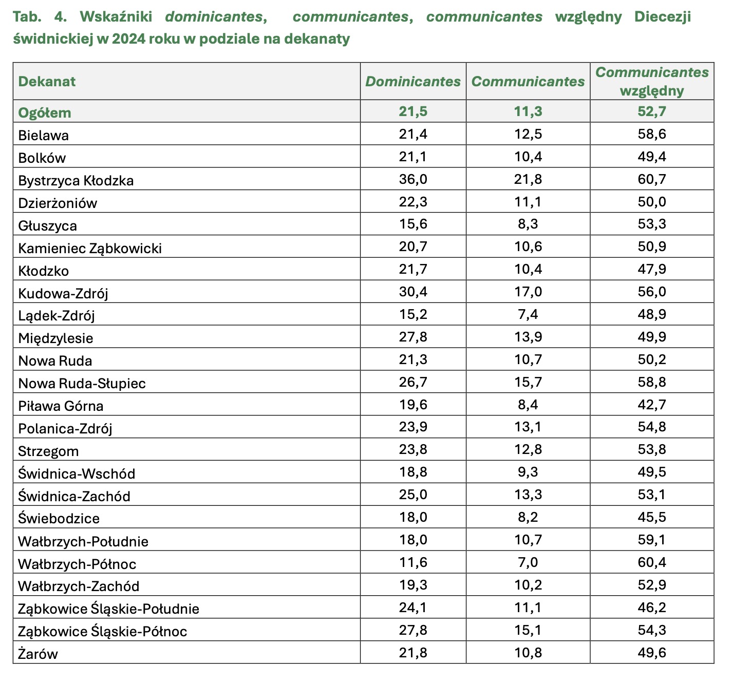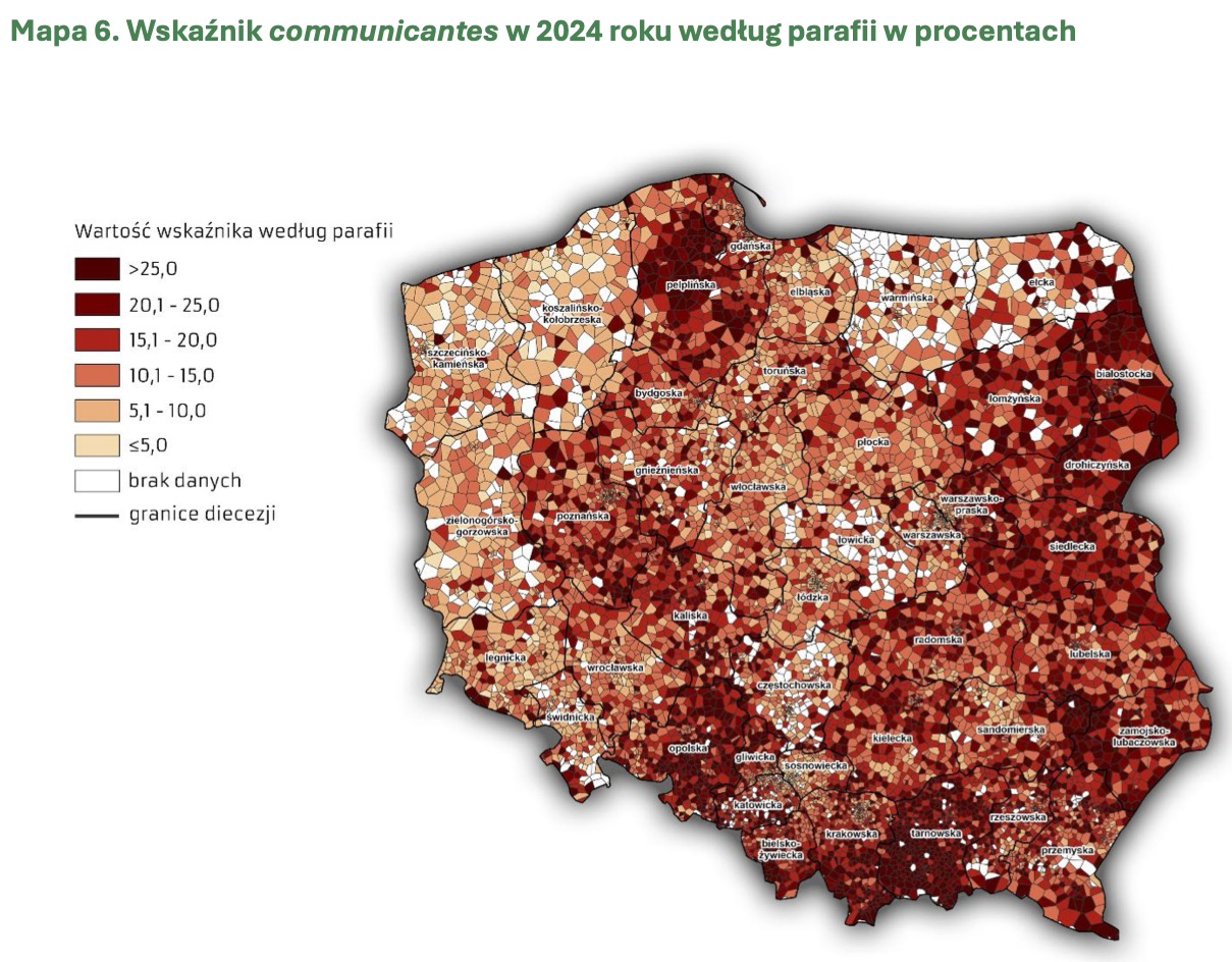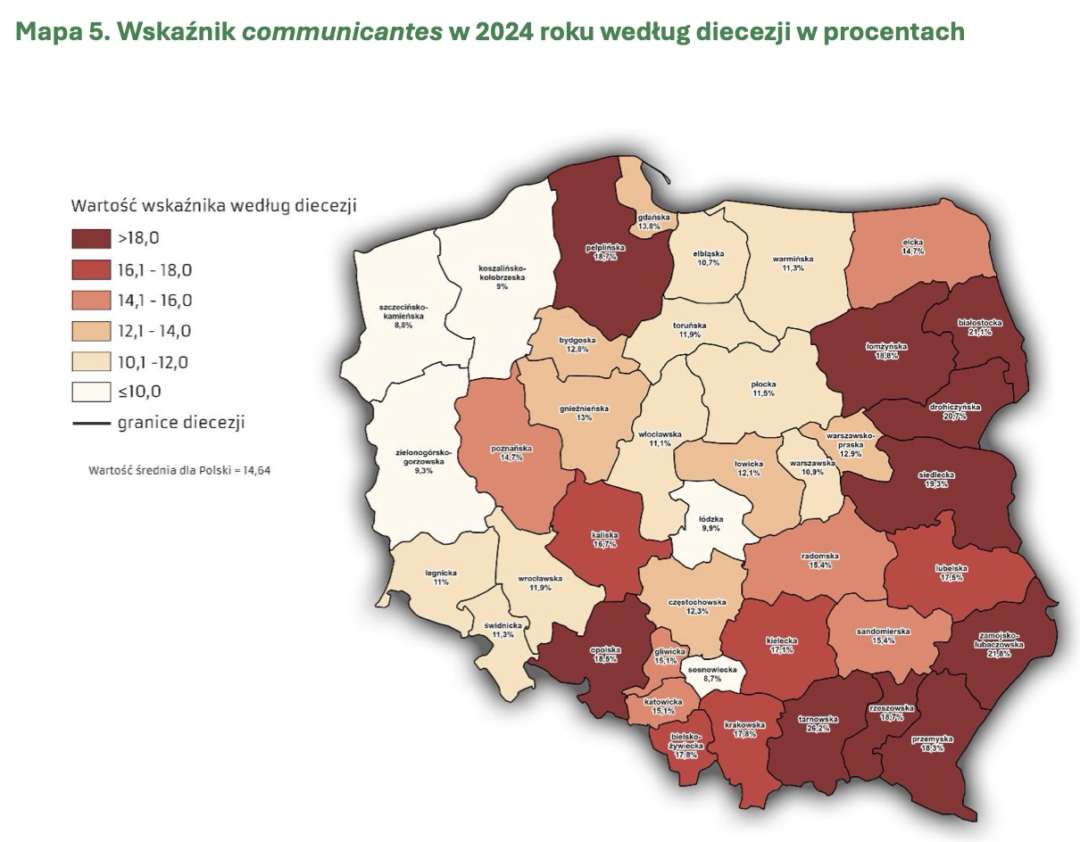 – Najwyższy odsetek osób przyjmujących Komunię św. odnotowano w dekanatach: Bystrzyca Kłodzka (21,8%), Kudowa-Zdrój (17,0%), Nowa Ruda-Słupiec (15,7%), Ząbkowice Śląskie-Północ (15,1%). Najniższy odsetek osób przyjmujących Komunię św. odnotowano w dekanatach: Wałbrzych-Północ (7,0%), Lądek-Zdrój (7,4%), Świebodzice (8,2%), Głuszyca (8,3%) – wskazują. W raporcie zauważono również, że chociaż najniższe poziomy dominicantes i communicantes odnotowano w dekanacie Wałbrzych-Północ, to jednocześnie wyróżnia się on najwyższym w całej diecezji wskaźnikiem „communicantes względny” – spośród tych, którzy przyszli do kościołów w tym dekanacie, aż 60,4% przyjęło komunię.