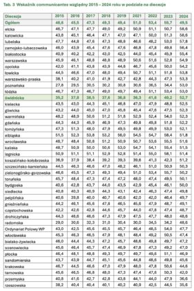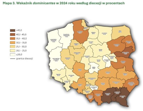 – Diecezja świdnicka w porównaniu z innymi diecezjami plasuje się poniżej średniej, jeśli chodzi o udział wiernych w praktykach niedzielnych. W 2024 roku średnia wskaźnika dominicantes [tj. osób uczestniczących w niedzielnej mszy – red.] dla kraju wynosiła 29,6%, a dla diecezji świdnickiej 21,5%. Z kolei wskaźnik communicantes [tj. osób przystępujących do komunii] dla kraju wynosił 14,6%, tymczasem 11,3% dla diecezji – wyliczają autorzy raportu. Wyraźnie powyżej średniej krajowej znalazł się za to wskaźnik communicantes względny, czyli procent wiernych przyjmujących komunię względem liczby osób obecnych na mszy, który w diecezji świdnickiej wynosił 52,7% przy średniej krajowej 49,5%.